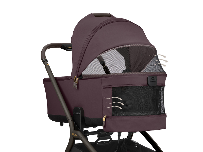 Pro pohodlí dítěte je součástí oboustranná měkká matrace se zimní stranou z kvalitního sametového materiálu a letní stranou z prodyšné síťoviny pro lepší ventilaci. Stříška má zipové prodloužení, sluneční clonu a doplňuje ji extra sluneční clona pro maximální stín. Ventilaci zajišťují síťované větrací otvory na stříšce i v oblasti hlavy. Praktická je i kapsa na telefon na zip. Voděodolný textilní materiál s UPF 50+chrání dítě před povětrnostními vlivy a slunečním zářením.