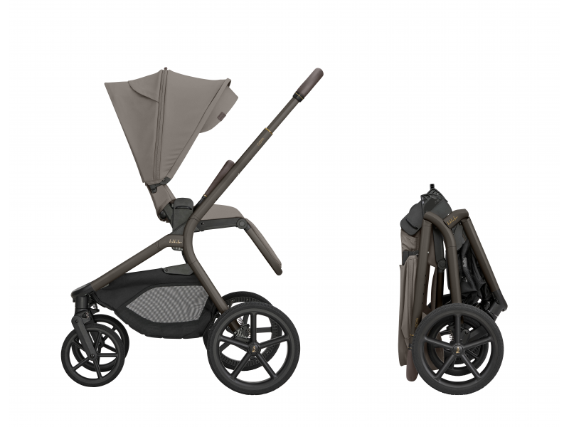 Po složení kočárek samostatně stojí. Pro snadné přenášení je připravený popruh přes rameno a madlo.