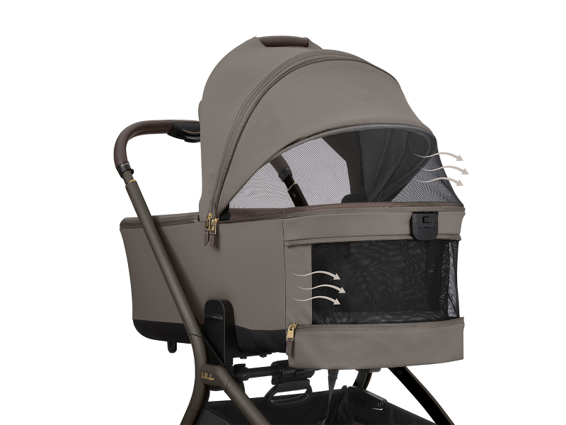 Pro pohodlí dítěte je součástí oboustranná měkká matrace se zimní stranou z kvalitního sametového materiálu a letní stranou z prodyšné síťoviny pro lepší ventilaci. Stříška má zipové prodloužení, sluneční clonu a doplňuje ji extra sluneční clona pro maximální stín. Ventilaci zajišťují síťované větrací otvory na stříšce i v oblasti hlavy. Praktická je i kapsa na telefon na zip. Voděodolný textilní materiál s UPF 50+ chrání dítě před povětrnostními vlivy a slunečním zářením.