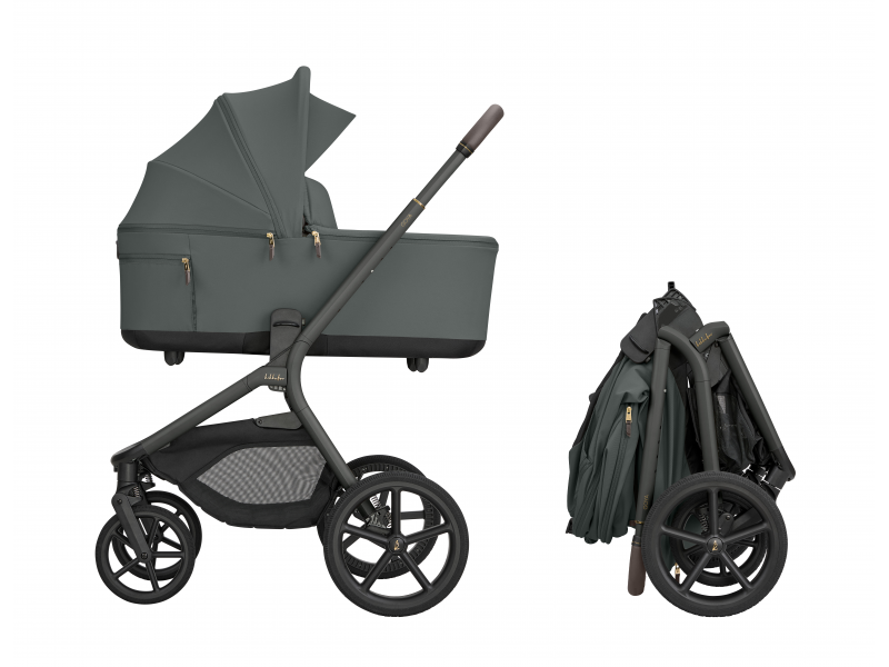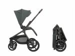 Po složení kočárek samostatně stojí. Pro snadné přenášení je připravený popruh přes rameno a madlo.