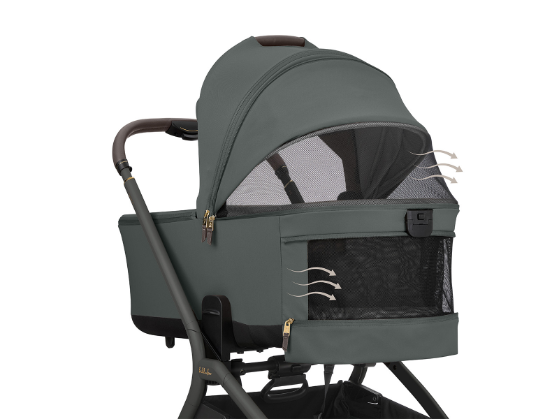 Pro pohodlí dítěte je součástí oboustranná měkká matrace se zimní stranou z kvalitního sametového materiálu a letní stranou z prodyšné síťoviny pro lepší ventilaci. Stříška má zipové prodloužení, sluneční clonu a doplňuje ji extra sluneční clona pro maximální stín. Ventilaci zajišťují síťované větrací otvory na stříšce i v oblasti hlavy. Praktická je i kapsa na telefon na zip. Voděodolný textilní materiál s UPF 50+ chrání dítě před povětrnostními vlivy a slunečním zářením.