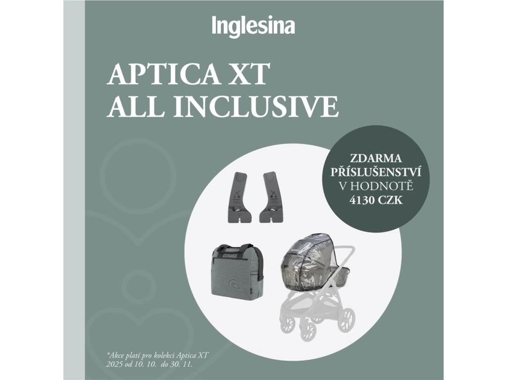 Kombinovaný kočárek Aptica XT 2025 se skládá z: prostorné hluboké vaničky XXL s 5-ti okénky, matrace Welcome Pad^^TM^^, stojanu Stand Up^^TM^^, sportovní sedačky All Season s boudičkou a nánožníkem, košíku, držáku pohárku a nového odlehčeného adaptivního podvozku Aptica XT.