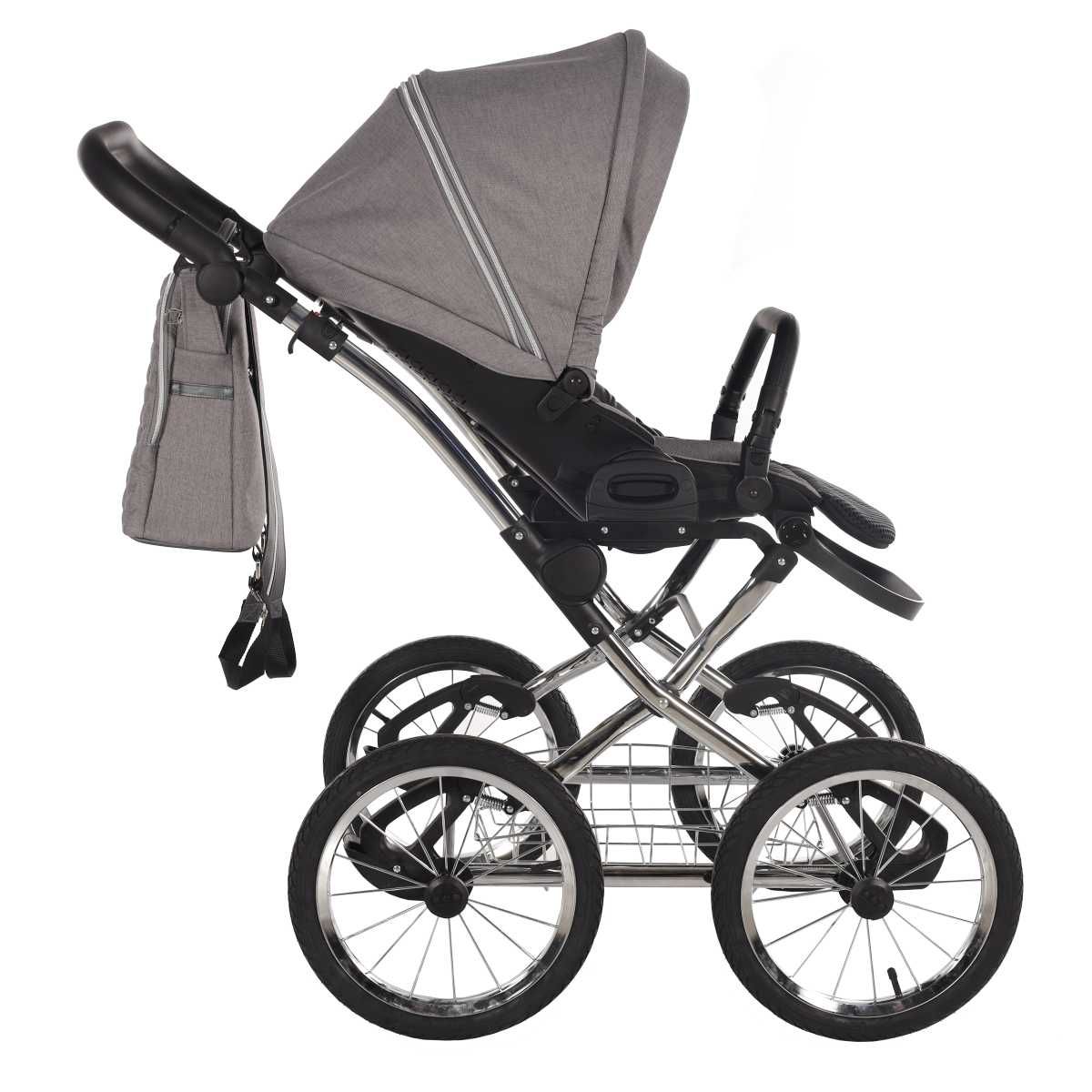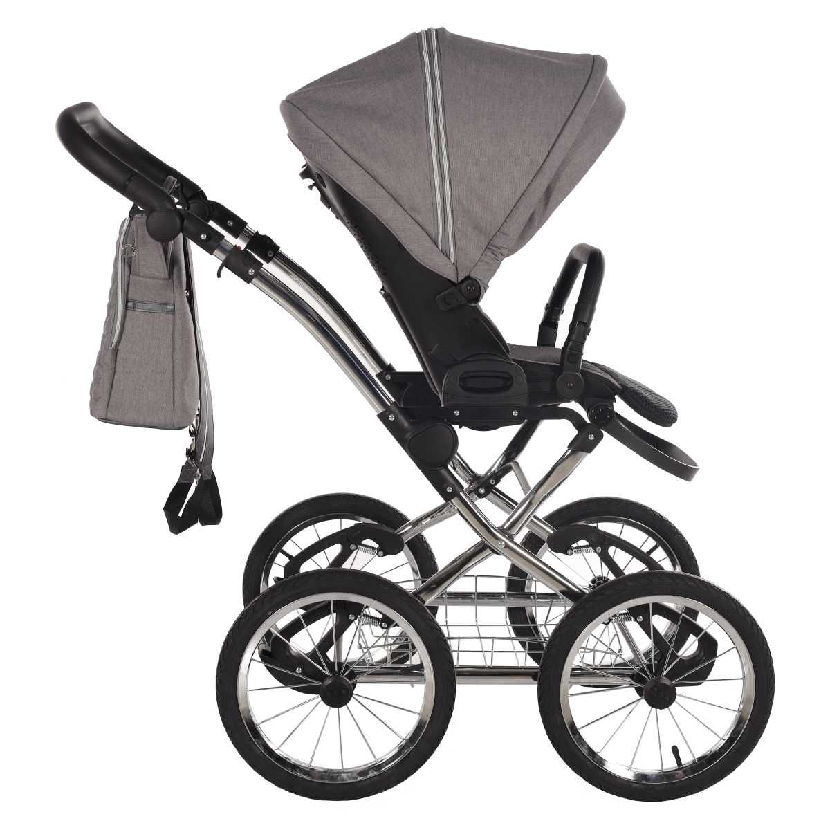 Houpací retro podvozek je z pochromované oceli – pevný a dokonale houpací, díky pružinovému zavěšení všech kol. Projedete ním takřka veškerý nerovný terén od štěrkové nebo polní cesty, až po krkolomné lesní cestičky.