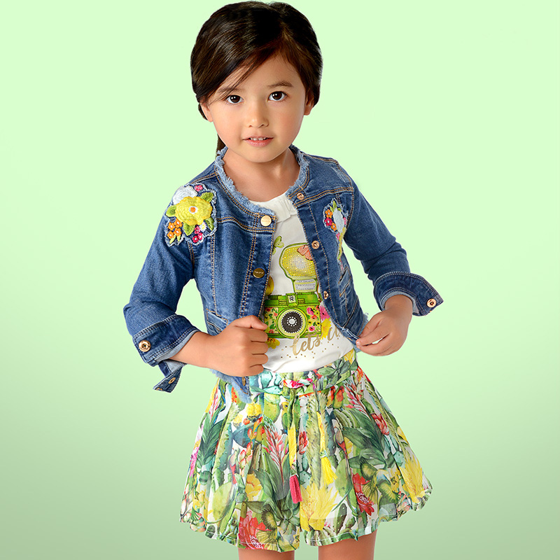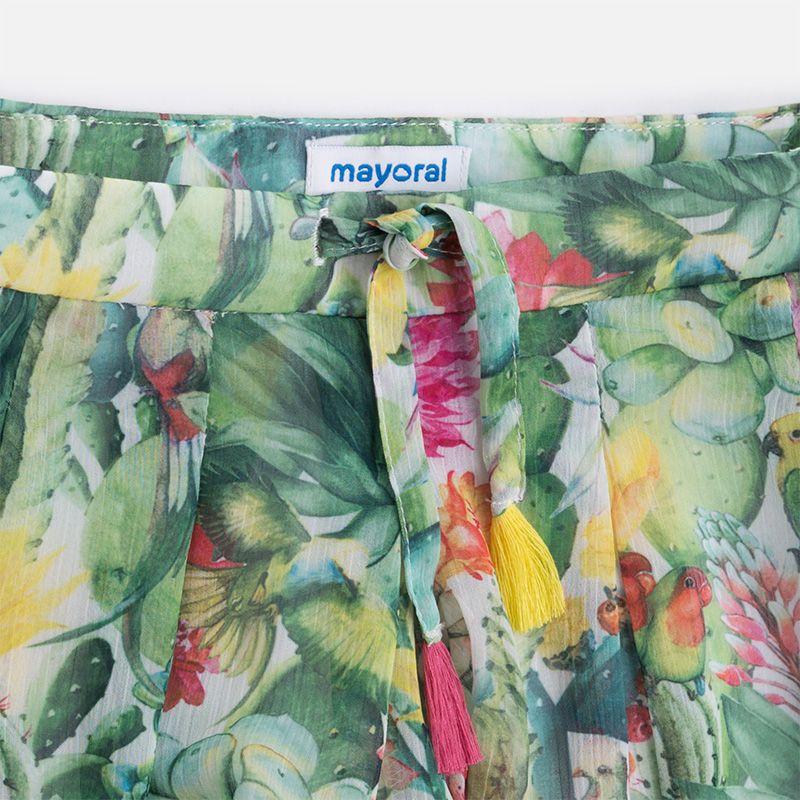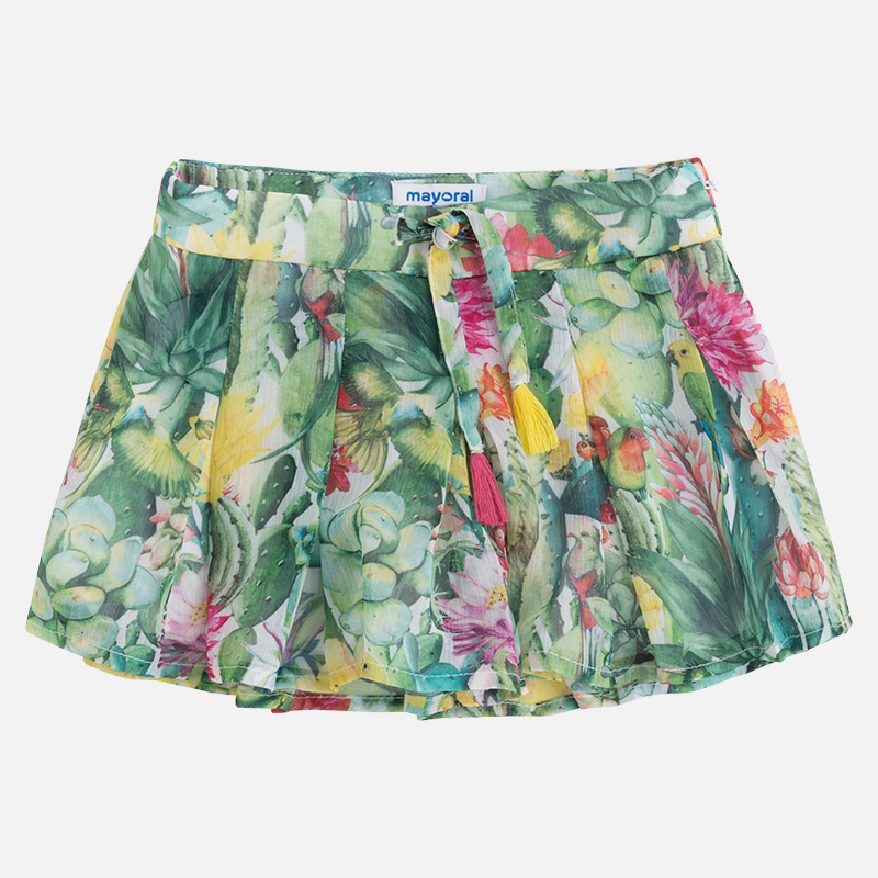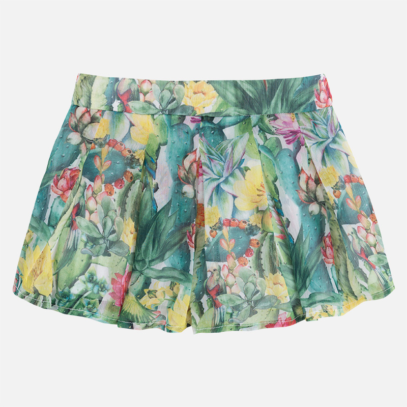 Krásné květované kraťásky pro malou parádnici od kvalitní španělské značky MAYORAL. Kraťásky vypadající jako sukýnka se šňůrkou na zavázání.