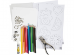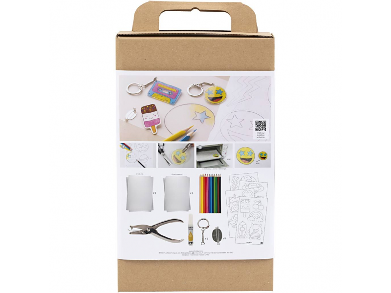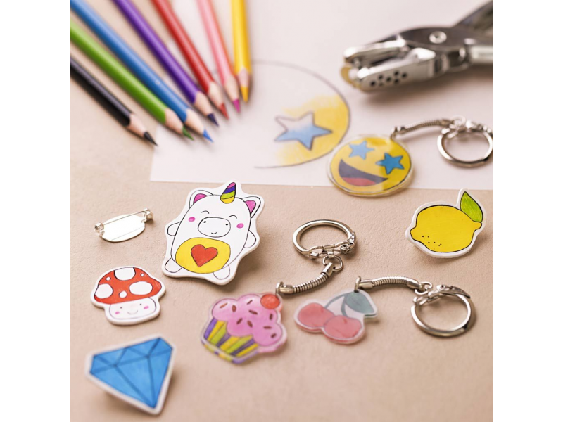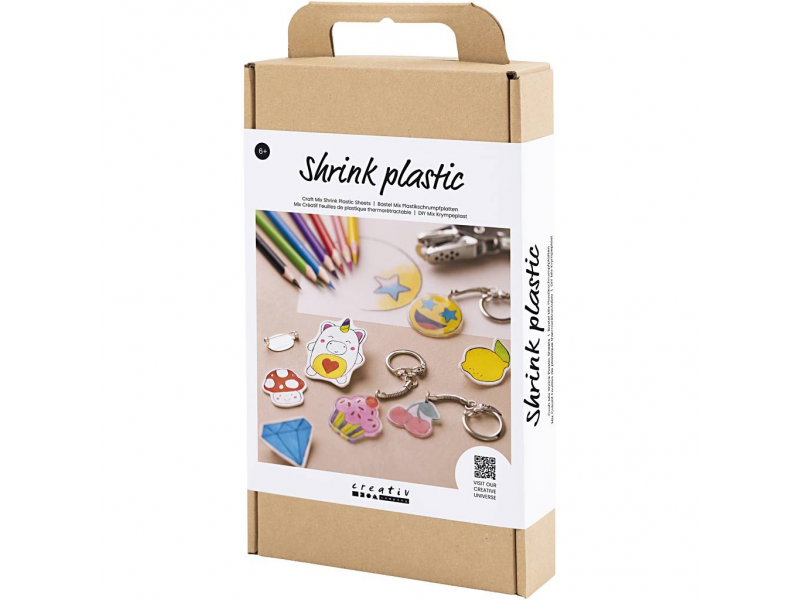 Originální kreativní sada pro výrobu přívěsků a odznáčků ze smršťovací fólie. Zábavná sada dětem umožní nakreslit vlastní motivy na smršťovací fólii, vybarvit je pastelkami a potom sledovat kouzelný proces jejich smrštění v troubě. Výsledkem jsou malé pevné přívěsky pro výrobu originálních doplňků – klíčenky, brože nebo ozdoby na batoh. V sadě je vše potřebné včetně návodu, který najdete na krabičce nebo online po naskenování QR kódu.