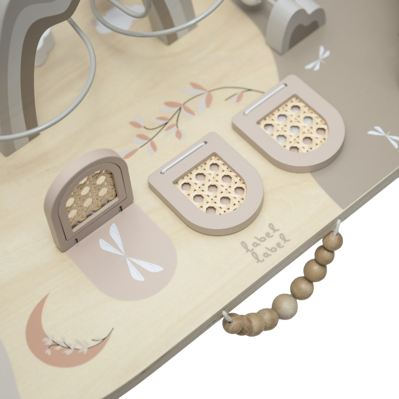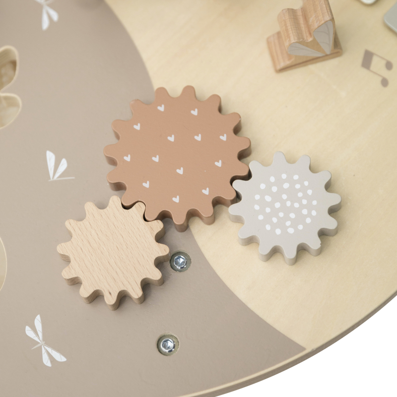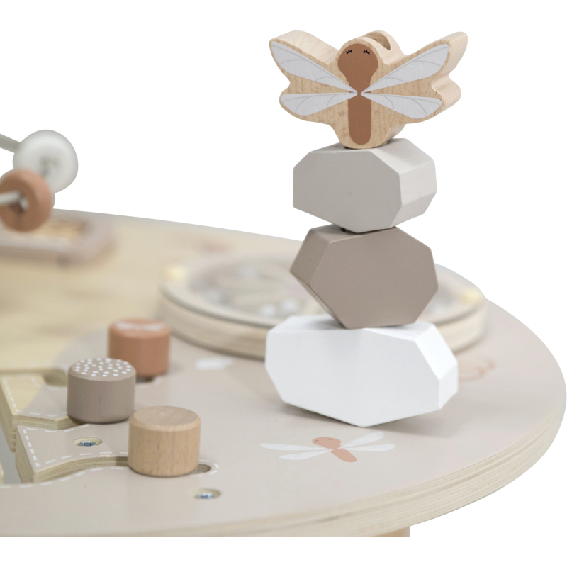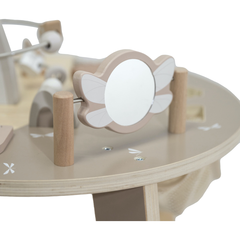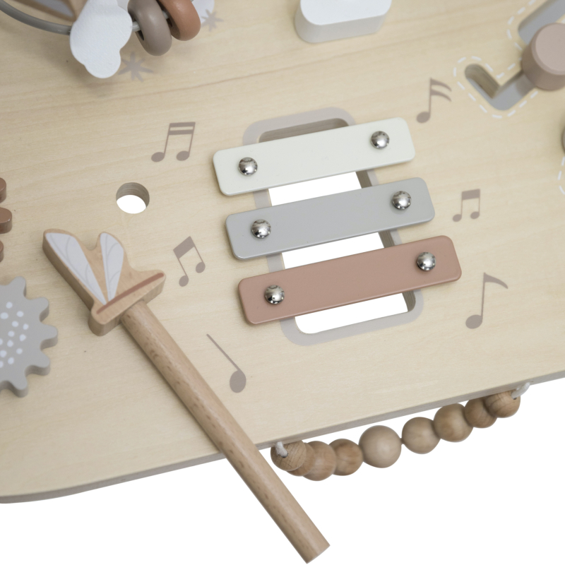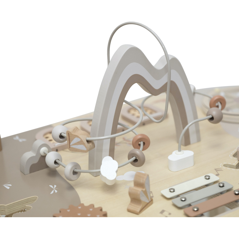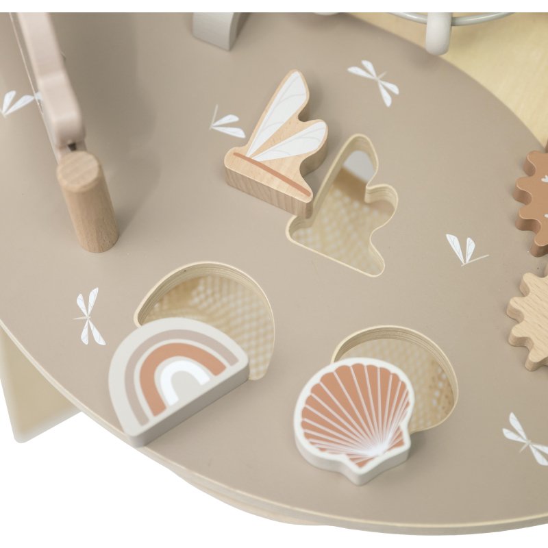 Aktivity jako otevírací okénka Peek-a-Boo, stohovací kostky, vkládačka tvarů, zrcátko, spirála s korálky a mnoho dalších podnětů podporují rozvoj dítěte a povzbuzují jeho fantazii.