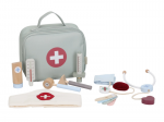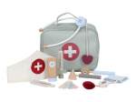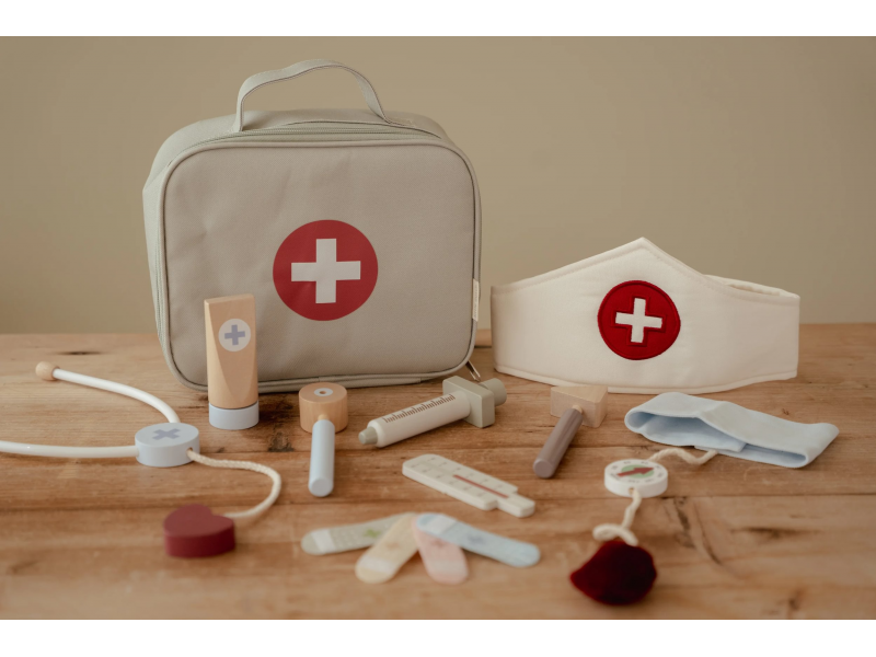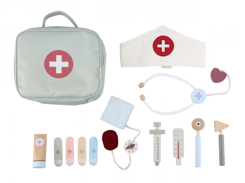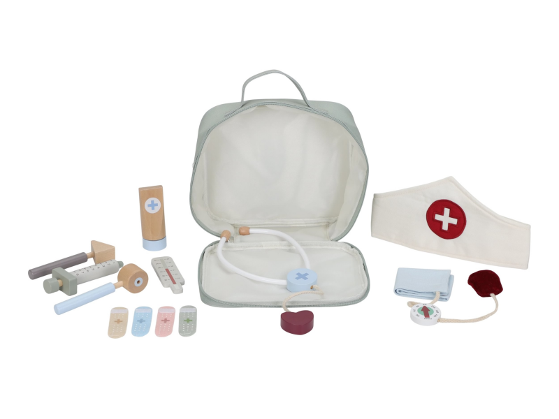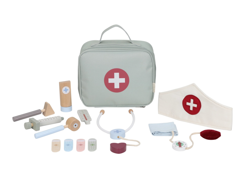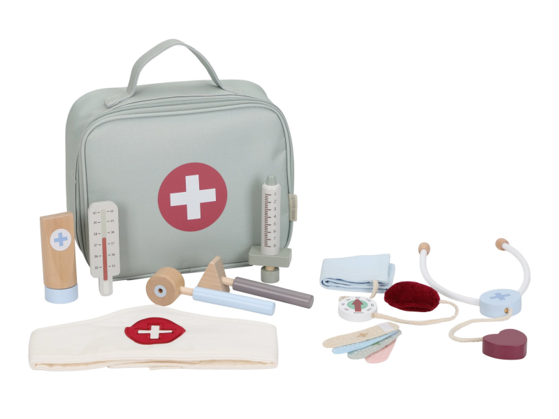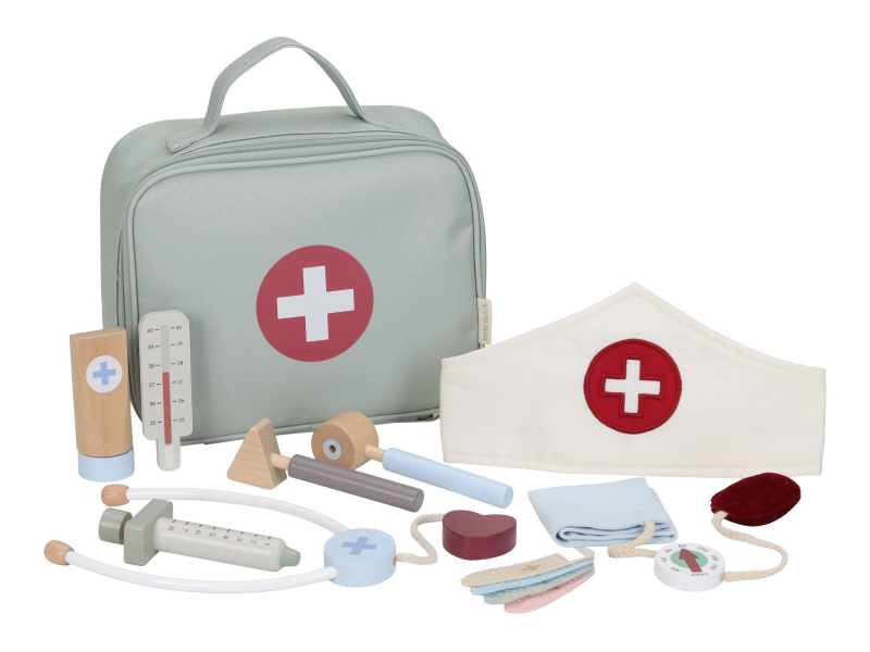 Paní doktorko, pane doktore – mohl/a byste se na mě podívat? S touto krásnou dřevěnou doktorskou sadou bude vaše dítě připravené postarat se o každého pacienta. Textilní lékařská taška ukrývá veškeré základní vybavení: teploměr, injekci, obvazy, stetoskop, tlakoměr a dokonce i doktorskou čepici.