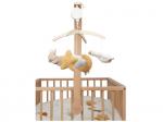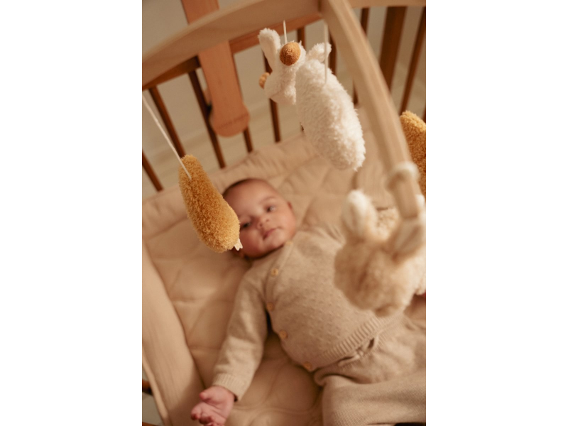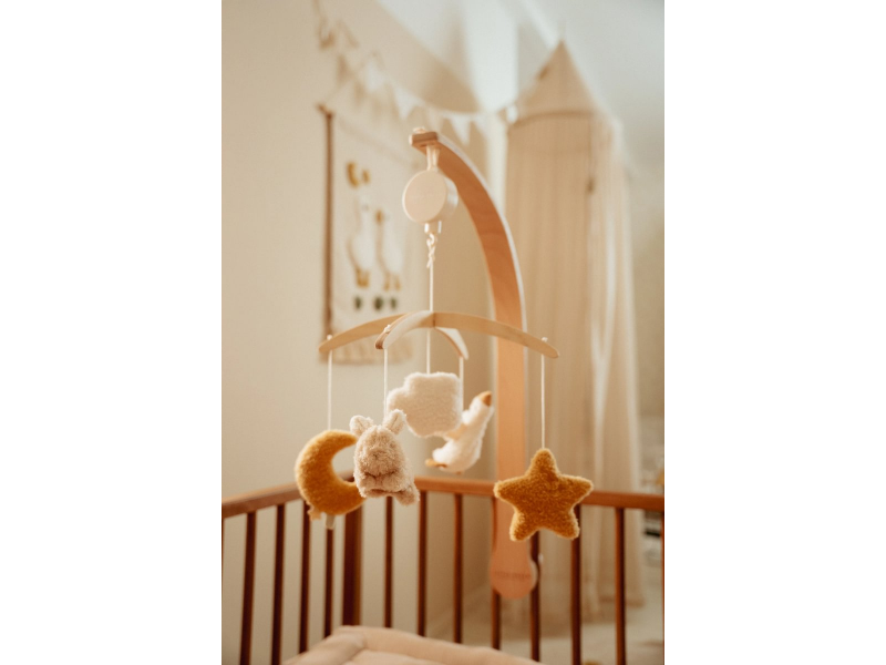 Kolotoč se snadno připevní na postýlku či ohrádku. Vysoce kvalitní dřevěný rám je stabilní a elegantní.