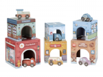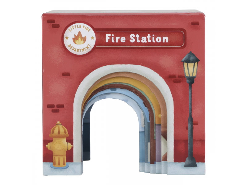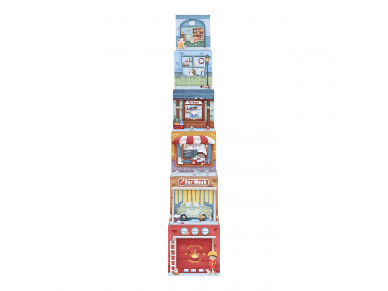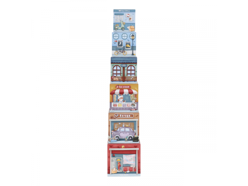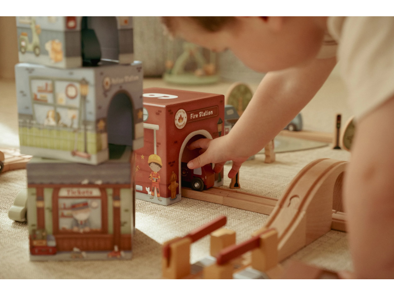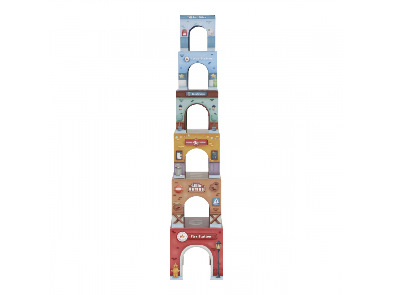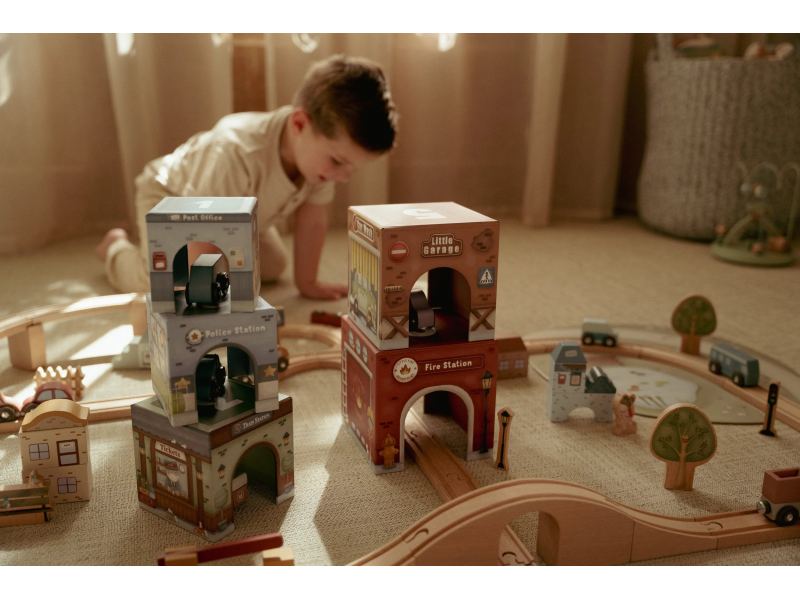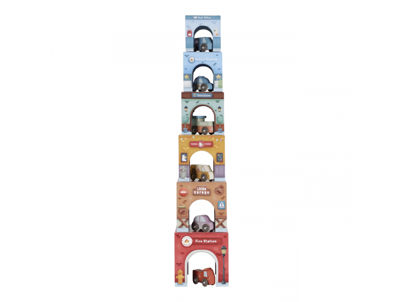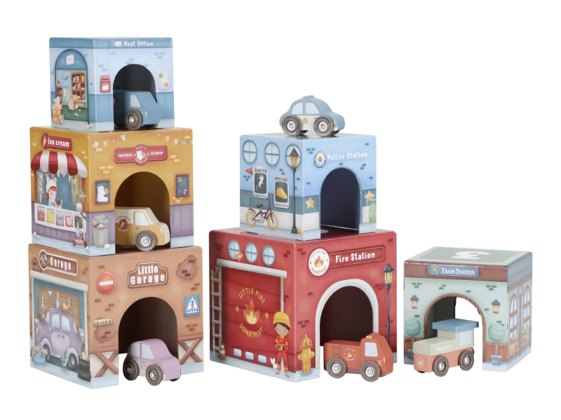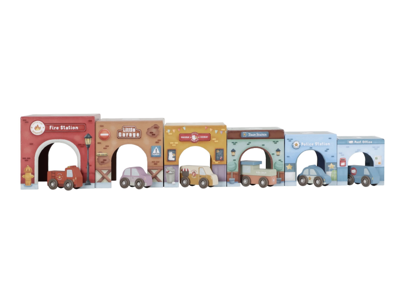 Stavět, objevovat a hrát si! Tato nápaditá sada Little Duch obsahuje šest ilustrovaných kartonových kostek různých velikostí, které představují budovy jako požární stanici, garáž nebo poštu – a k nim 6 dřevěných vozidel, patřících k jednotlivým budovám.