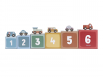 Sadu tvoří 6 kartonových kostek a 6 dřevěných vozidel.