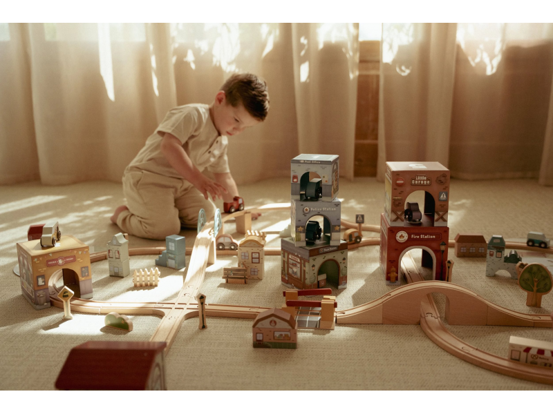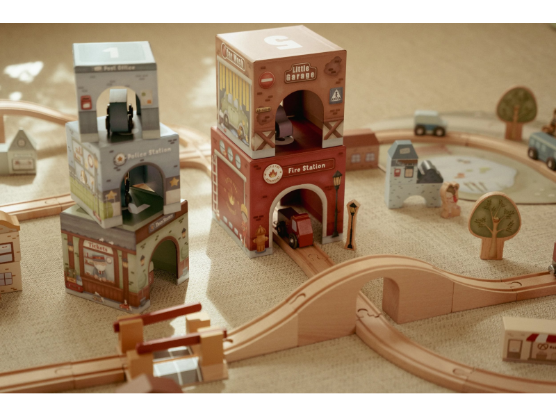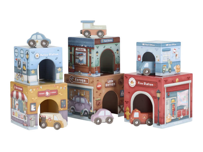 Děti mohou kostky stavět na sebe do vysoké věže i rozkládat je po podlaze a vytvářet celé městečko. Kostky lze skvěle kombinovat i s vláčkodráhou Little Dutch, kde vláček i autíčka pohodlně projedou pod kostkami jako pod mosty. Každá kostka má jinou ilustraci, která podporuje rozvoj fantazie, a každé vozidlo má své vlastní parkovací místo.