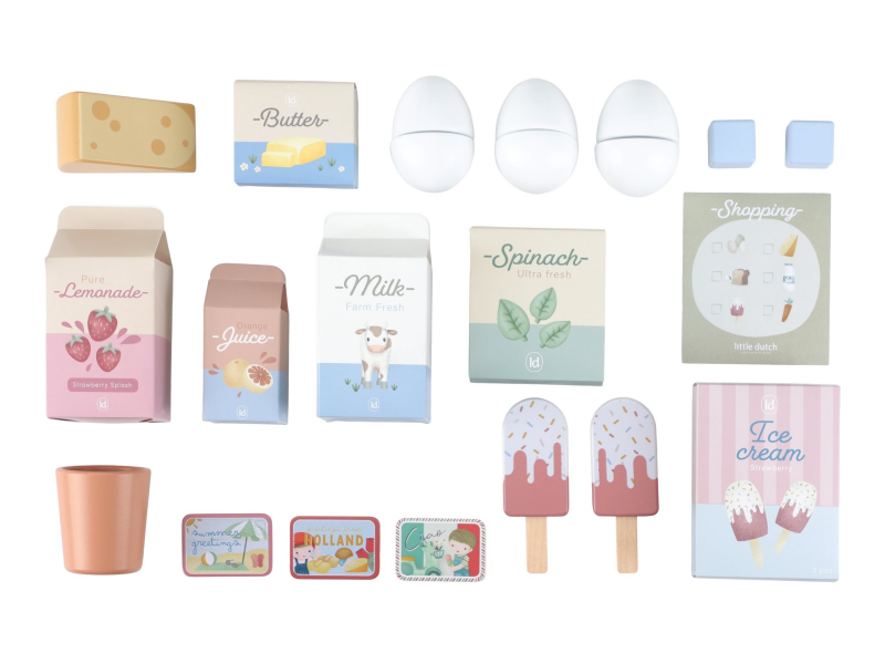 Součástí balení je 19 doplňků, které se hodí pro uložení do lednice: máslo, sýr, 3 vejce, 2 kostky ledu, limonáda, džus, mléko, mražený ěpenát, 3 zmrzliny, kelímek, 3 magnety na lednici a nákupní seznam.