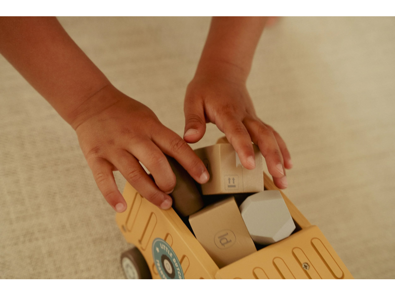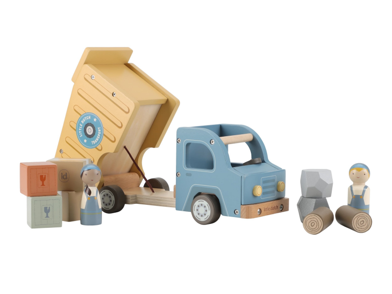 Náklaďák se sklápěčkou je ideální hračka pro malé stavitele, kteří chtějí převážet, vykládat a vymýšlet nové příběhy. Kvalitní dřevěné provedení s důrazem na detail zajišťuje dlouhou životnost a hodiny kreativní hry. Auto má funkční sklápěcí korbu, díky které děti snadno naloží a vyloží svůj náklad. Součástí balení jsou dva řidiči a různé typy nákladu – klády, kameny a dřevěné bedýnky. Děti tak mohou vymýšlet stále nové příběhy, rozvíjet fantazii a procvičovat jemnou motoriku.