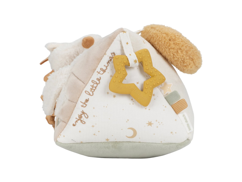 Dotýkej se, hraj si a objevuj! Tento měkký trojhranný polštářek nabízí vašemu miminku spoustu vjemů a zábavy. Různé textury, jemné zvuky a roztomilé detaily podněcují smyslový vývoj a motivují ke zkoumání.
