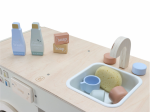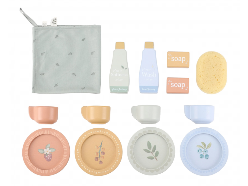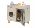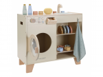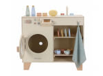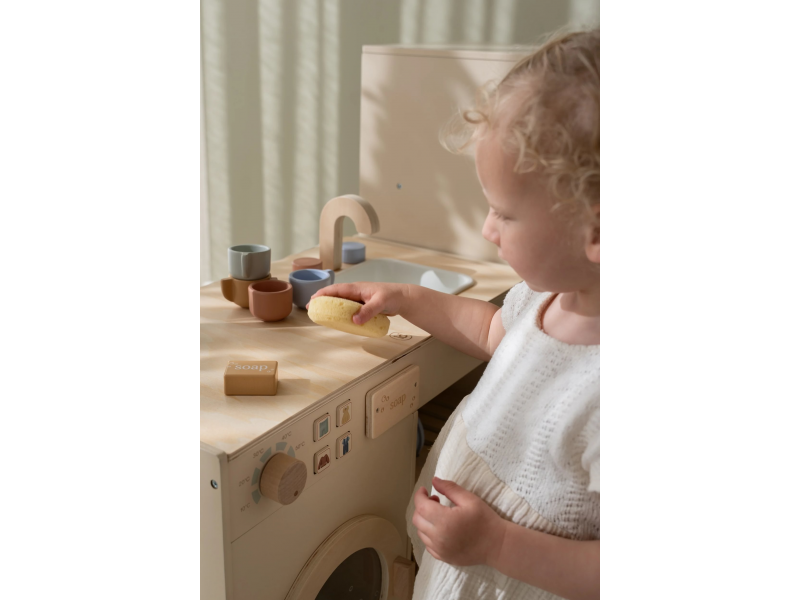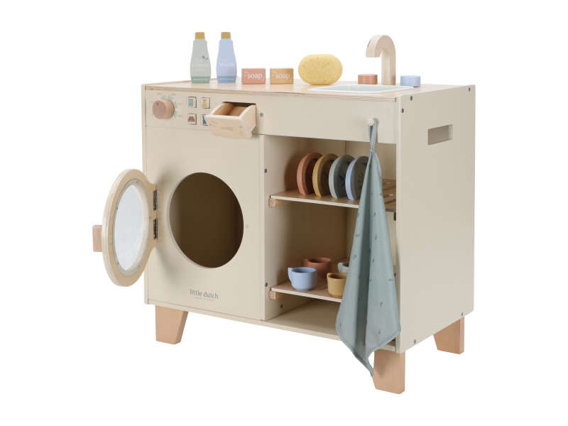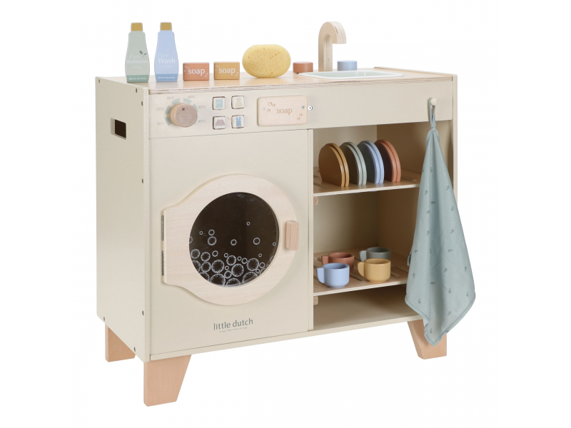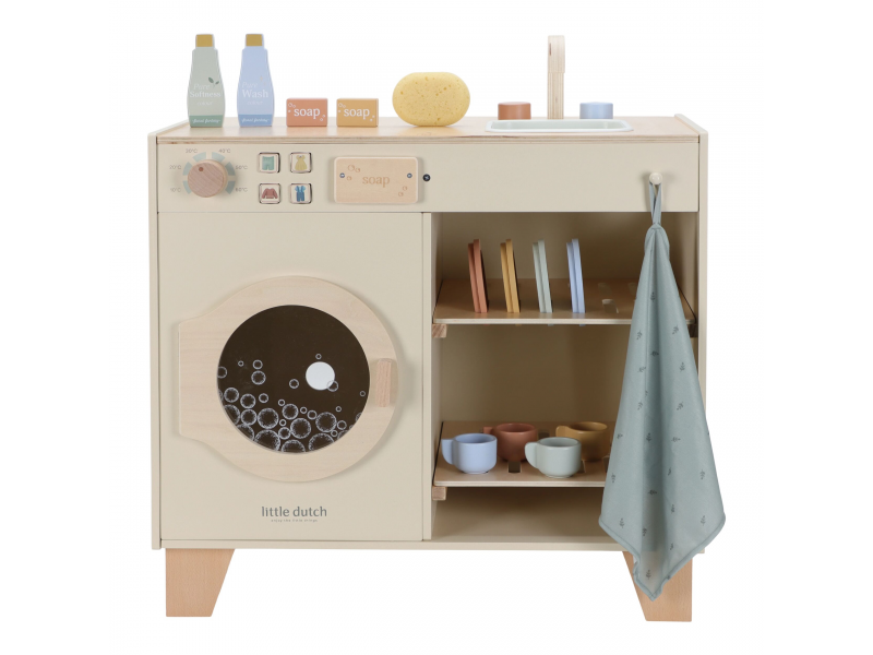 Stylový dřevěný set pračky a dřezu Little Dutch potěší každé dítě, které se rádo stará o své panenky či plyšáky. V pračce jim vypere jejich oblečky, v dřezu umyje nádobí, na kterém servírovalo panenkám svačinku. Díky otočným knoflíkům, tlačítkům i vysunovací přihrádce na prací prostředek působí pračka i dřez realisticky a podněcují děti k nápodobě domácích prací. Součástí balení je bohaté příslušenství: čtyři šálky, čtyři podšálky, mycí houba, prací prostředek, mýdlové kostky a látková utěrka.