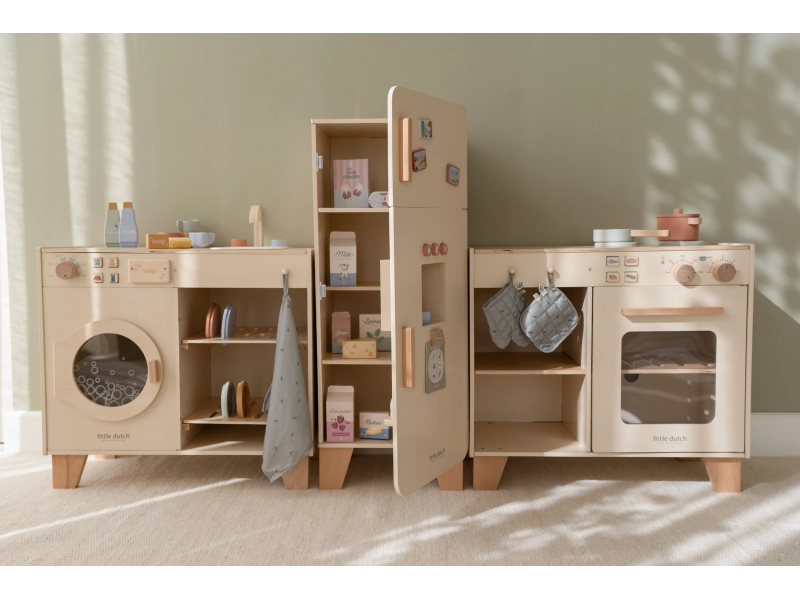 Díky možnosti kombinace s kuchyňkou a lednicí z kolekce dřevěných hraček Little Dutch lze vytvořit plně vybavenou herní kuchyň. Tu pak můžete doplnit dalšími dřevěnými hračkami Little Dutch, např. kávovarem, toustovačem, kuchyňskou váhou, krájecím ovocem, krájecí zeleninou, čajovým servisem apod.
