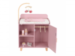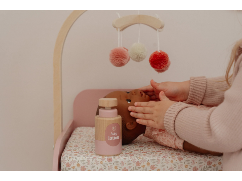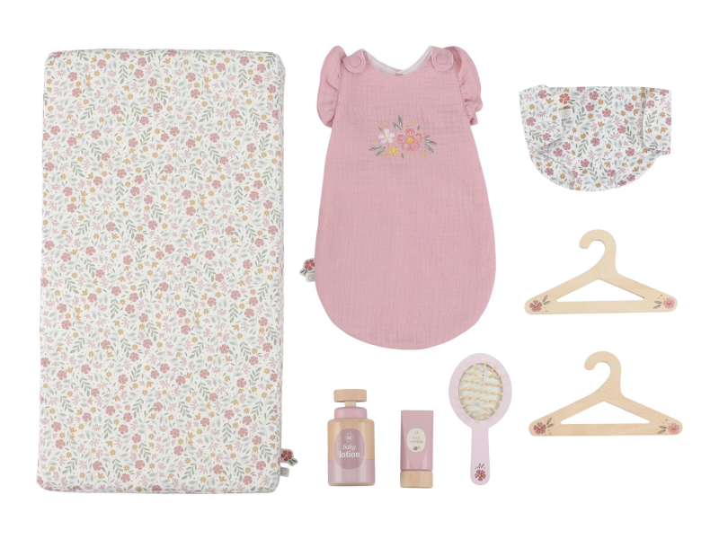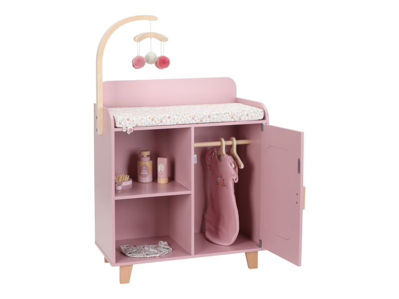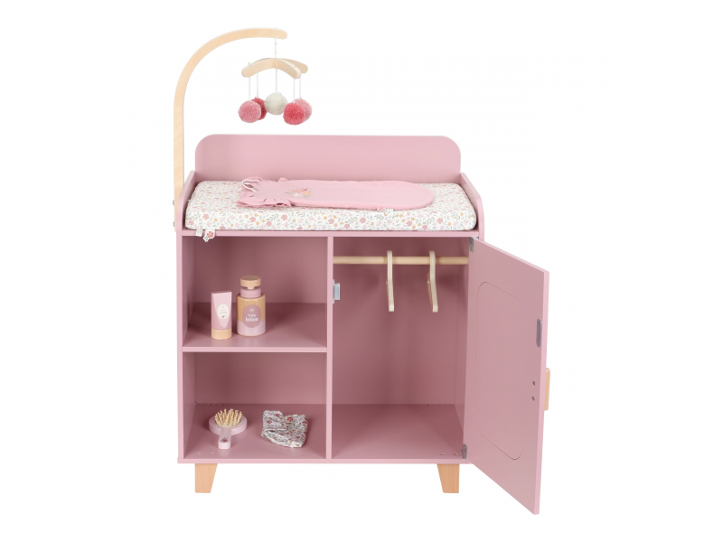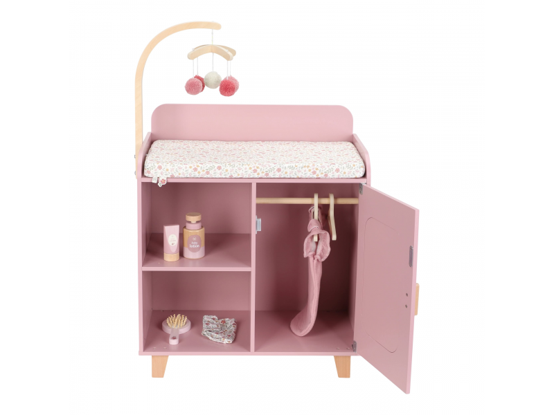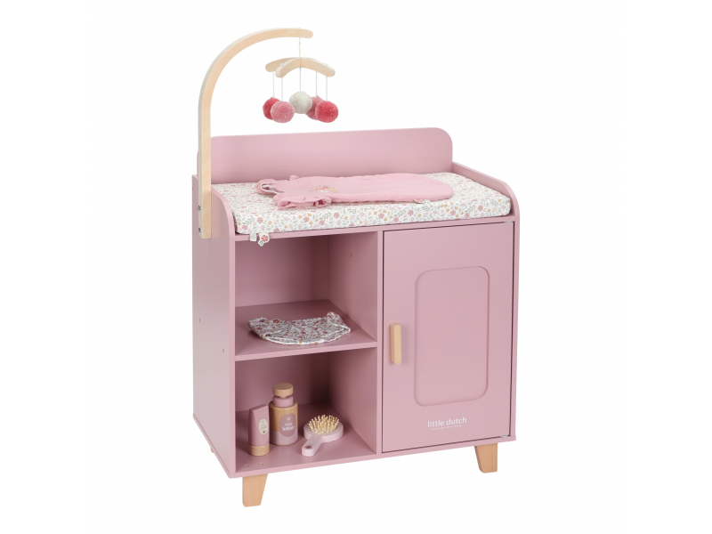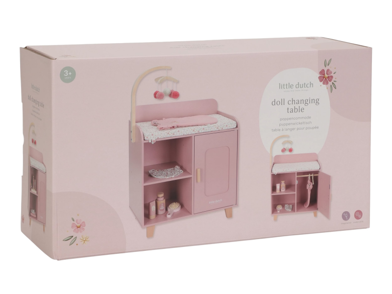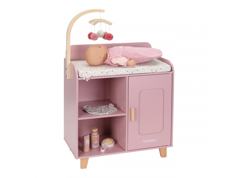 Elegantní přebalovací pult Little Dutch umožňuje dětem napodobovat každodenní péči o miminko a starat se o panenky stejně, jako se maminka či tatínek starají o své miminko. Součástí balení je měkká přebalovací podložka s romantickým květinovým potiskem, závěsný kolotoč, spací pytel, textilní plena, dvě ramínka a dřevěné doplňky pro péči o panenku. Praktická skříňka a poličky ve spodní části přebalovacího pultu umožňují mít vše potřebné pro péči o panenku vždy po ruce a uklizené.