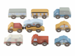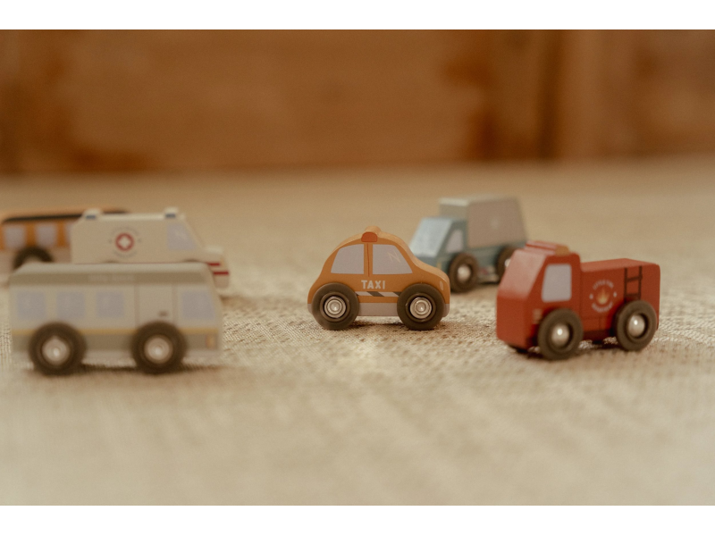 Město je pořád v pohybu! Tato sada dřevěných vozidel různých profesí je připravena vyrazit do akce a pomáhat tam, kde je třeba. Hasičské auto vyjíždí k požáru, policejní vůz hlídkuje po městě a nákladní auto dováží zásoby – každý den přináší nové dobrodružství.
