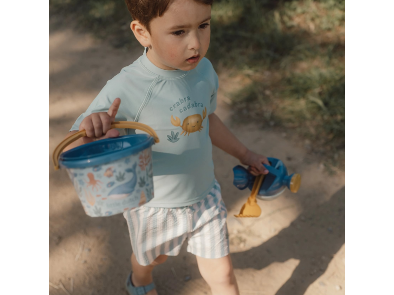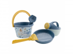 Sada na písek s krásným potiskem motivů ze života pod mořskou hladinou se bude dětem hodit doma na zahradě i u moře na pláži. Sadu tvoří kyblík, konvička, hrabičky, lopatka a sítko v kvalitním provedení z pevného plastu.