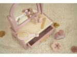 Toaletní stolek s doplňky v dřevěném provedení potěší malou parádnici a stane se i krásnou dekorací v dětském pokoji. Stolek je vybaven otočným zrcadlem, kartáčem na vlasy, parfémem, rtěnkou, očními stíny, pilníkem a lakem na nehty. Zásuvka je ideální pro uložení drobností.