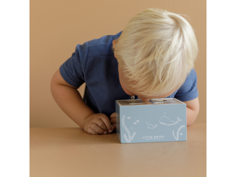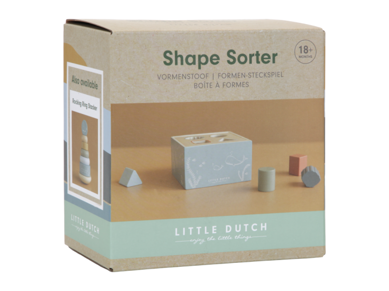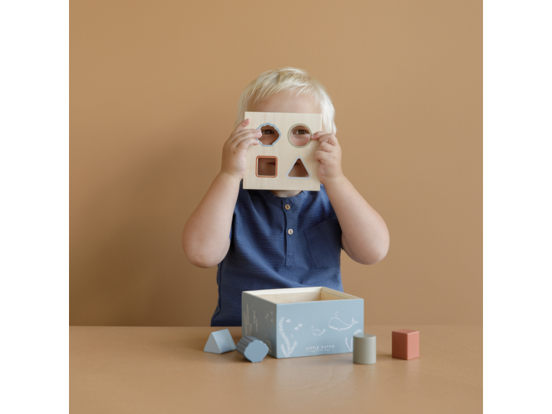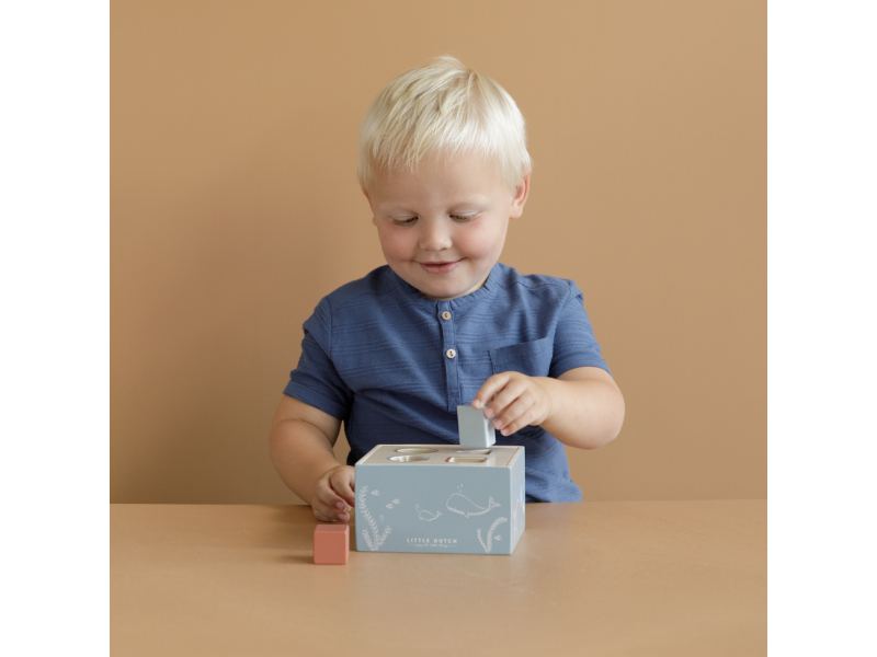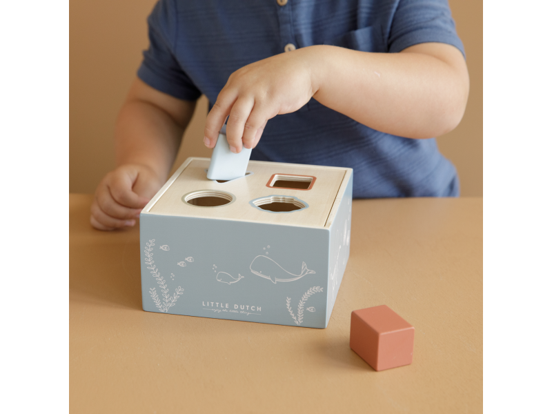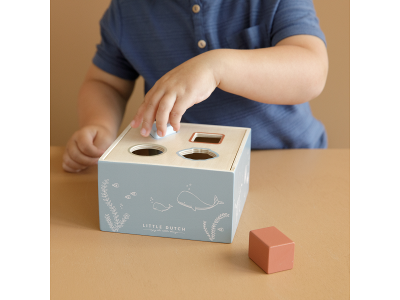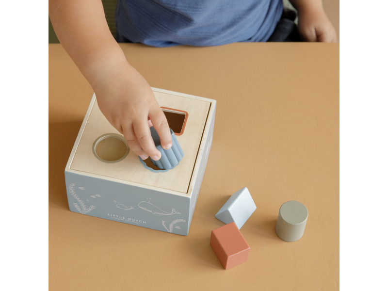 Vkládačka dřevěných tvarů učí děti kreativním zpsůobem rozpoznávat tvary a barvy a zdokonalit svou koordinaci rukou a očí. Malé ručičky snadno uchopí kostky různých tvarů a pak je zatlačí do správného otvoru. Krabička s krásnými ilustracemi ze života pod mořem je vyrobena z pevného dřeva.