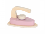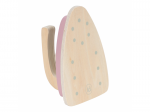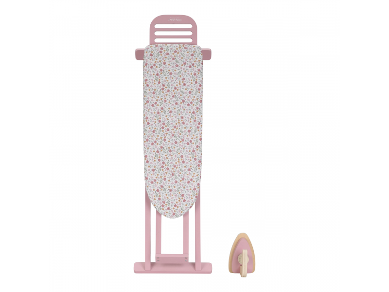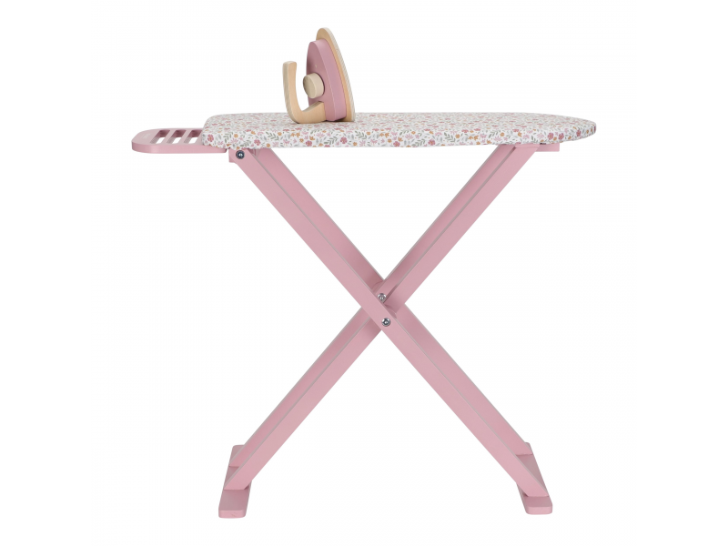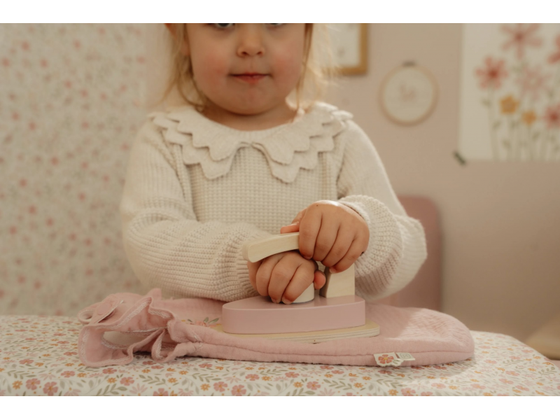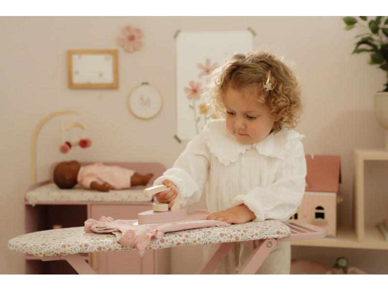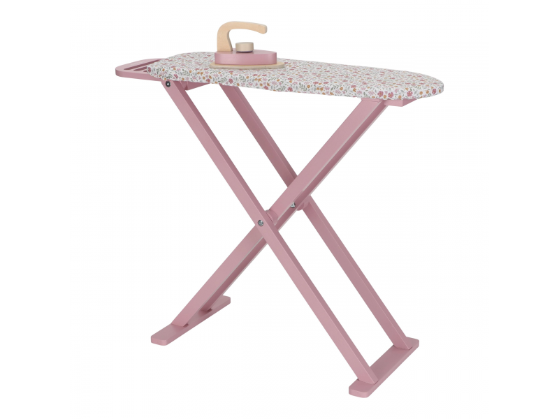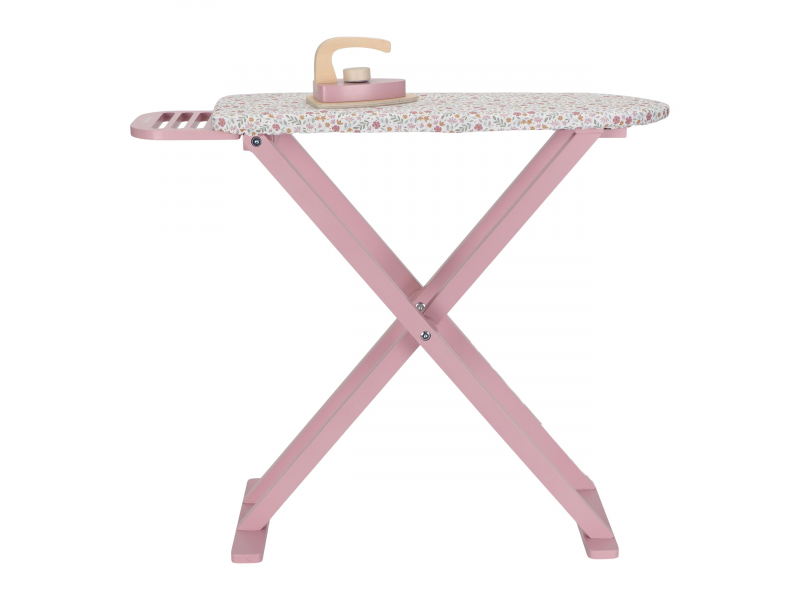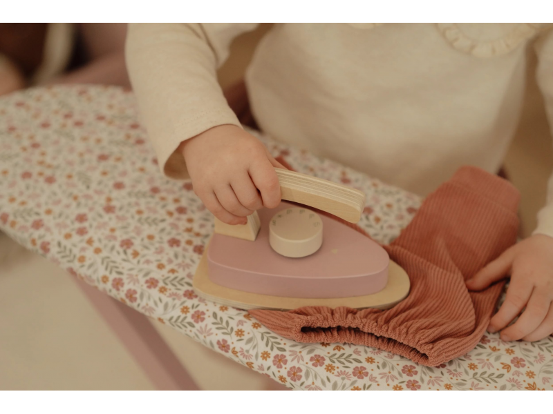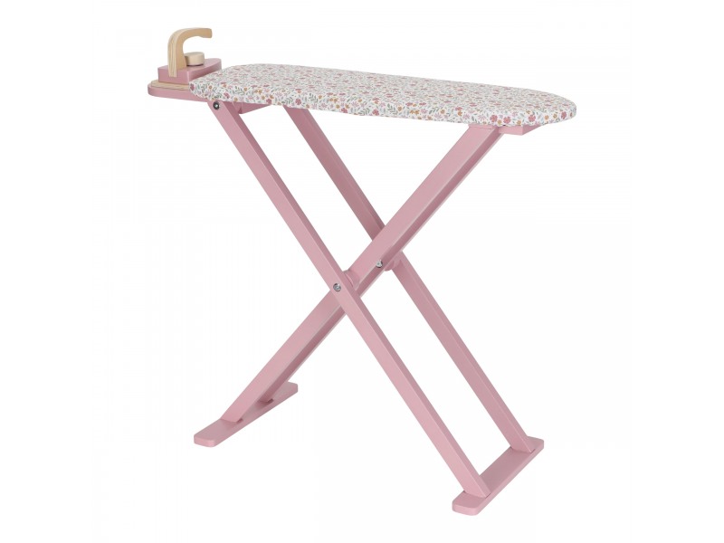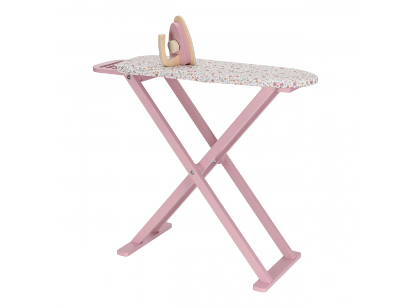 Žehlení oblečení panenkám bude radost s tímto krásným dřevěným žehlicím prknem a žehličkou. Skládací prkno je s textilním potahem s něžným květinovým potiskem vypadá jako opravdové, realisticky působí i běrevně sladěná dřevěná žehlička. Děti mohou hraním s žehličkou napodobovat dospělé a poznávat svět domácnosti zábavnou formou.