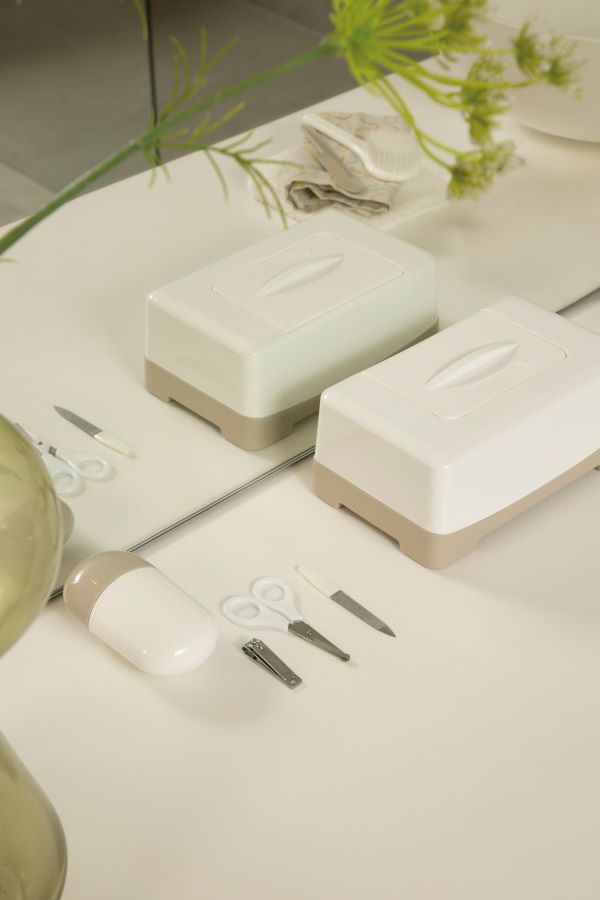 Manikůra obsahuje nůžky se zakulacenými konci, pilníček na nehty a také kleštičky na nehty. Vše je vyrobeno z nerezavějící ušlechtilé oceli. Krabička chrání před prachem a pomáhá udržovat manikuru v čistotě. Ale i přesto před každým použitím jednotlivé nástroje pečlivě očistěte a u novorozenců i desinfikujte roztokem lihu.