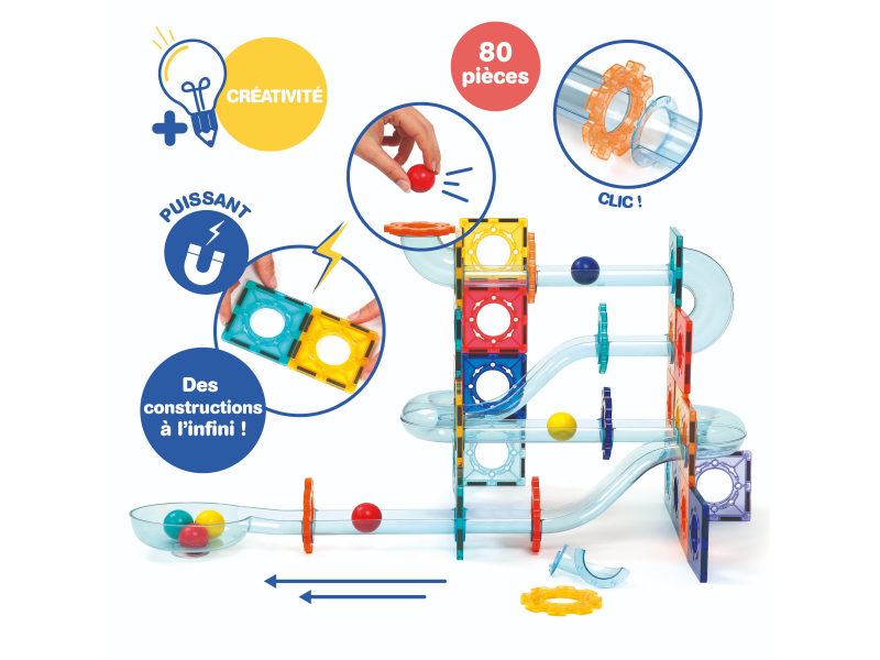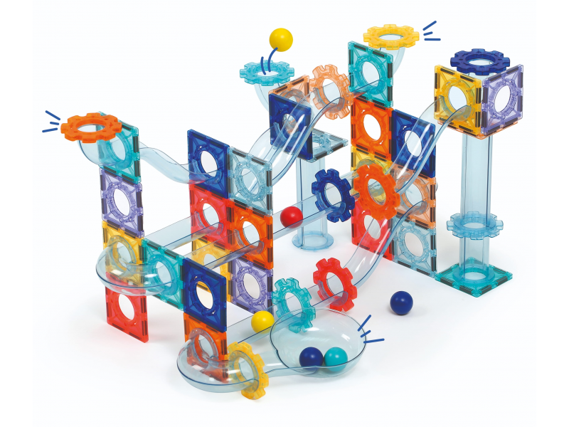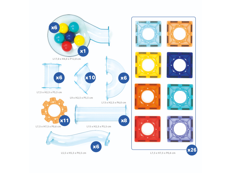 Obsah balení: 26 magnetických destiček, 48 dílů dráhy, 6 kuliček, úložný box