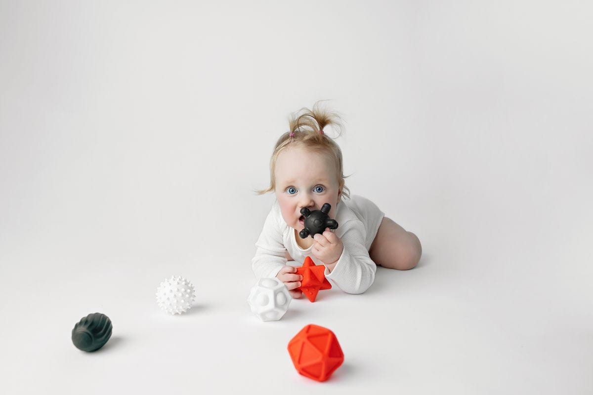 - Sada obsahuje 6 senzorických míčků různých velikostí a textur