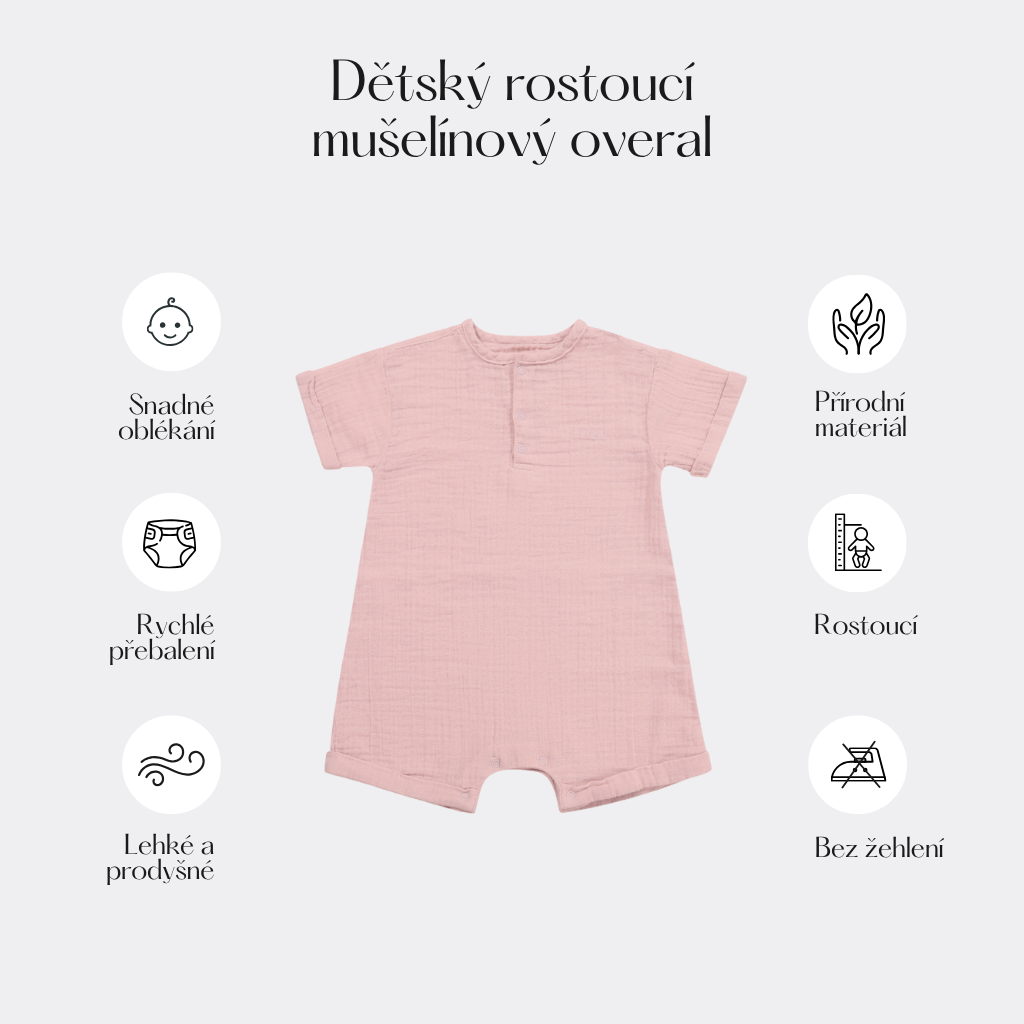 Mušelínový dětský rostoucí overal s krátkým rukávem je perfektní oblečení pro jarní a letní dny i noci.