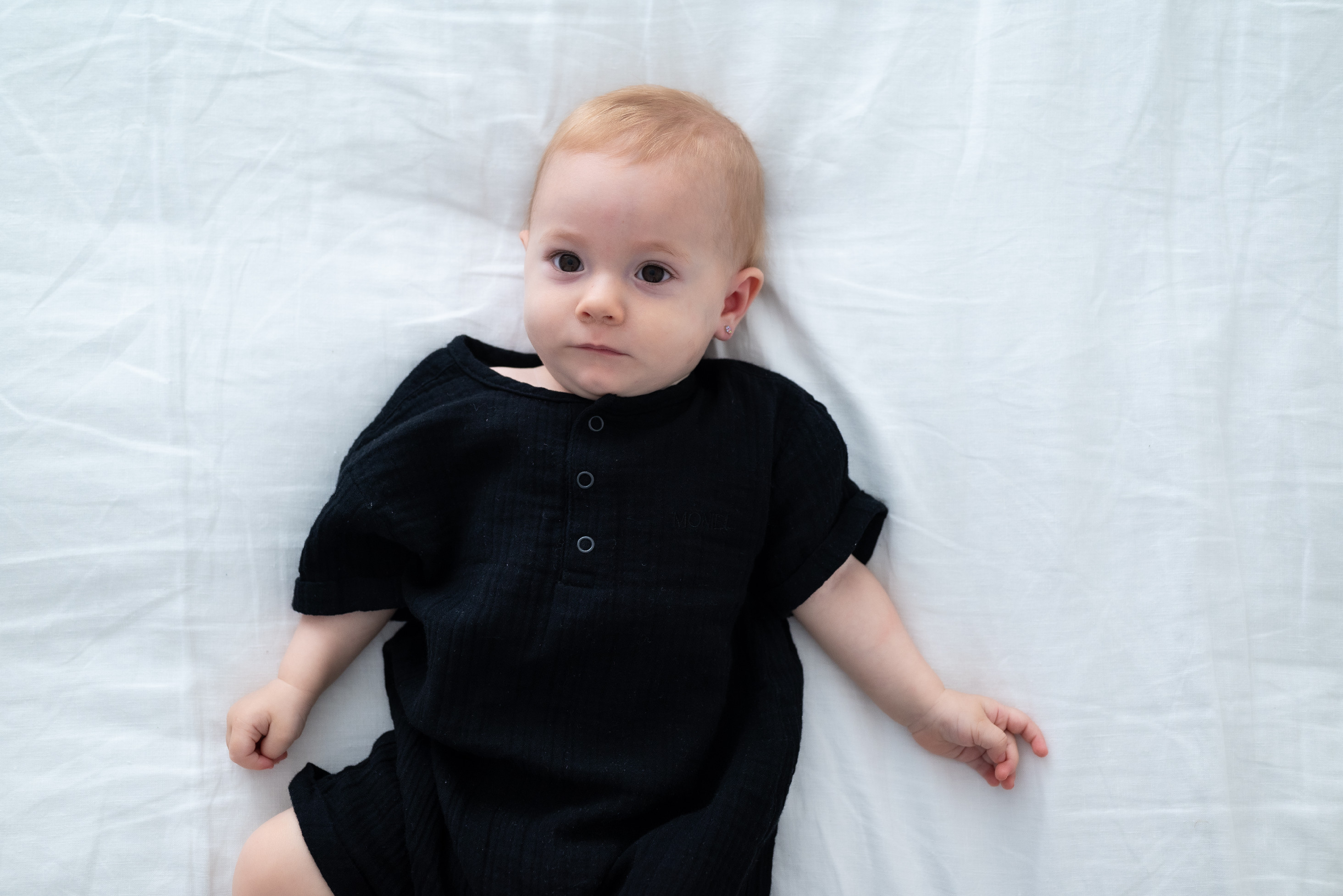 Moniel Dětský rostoucí mušelínový overal s krátkým rukávem Black 68/74/80 6-12 měsíců.