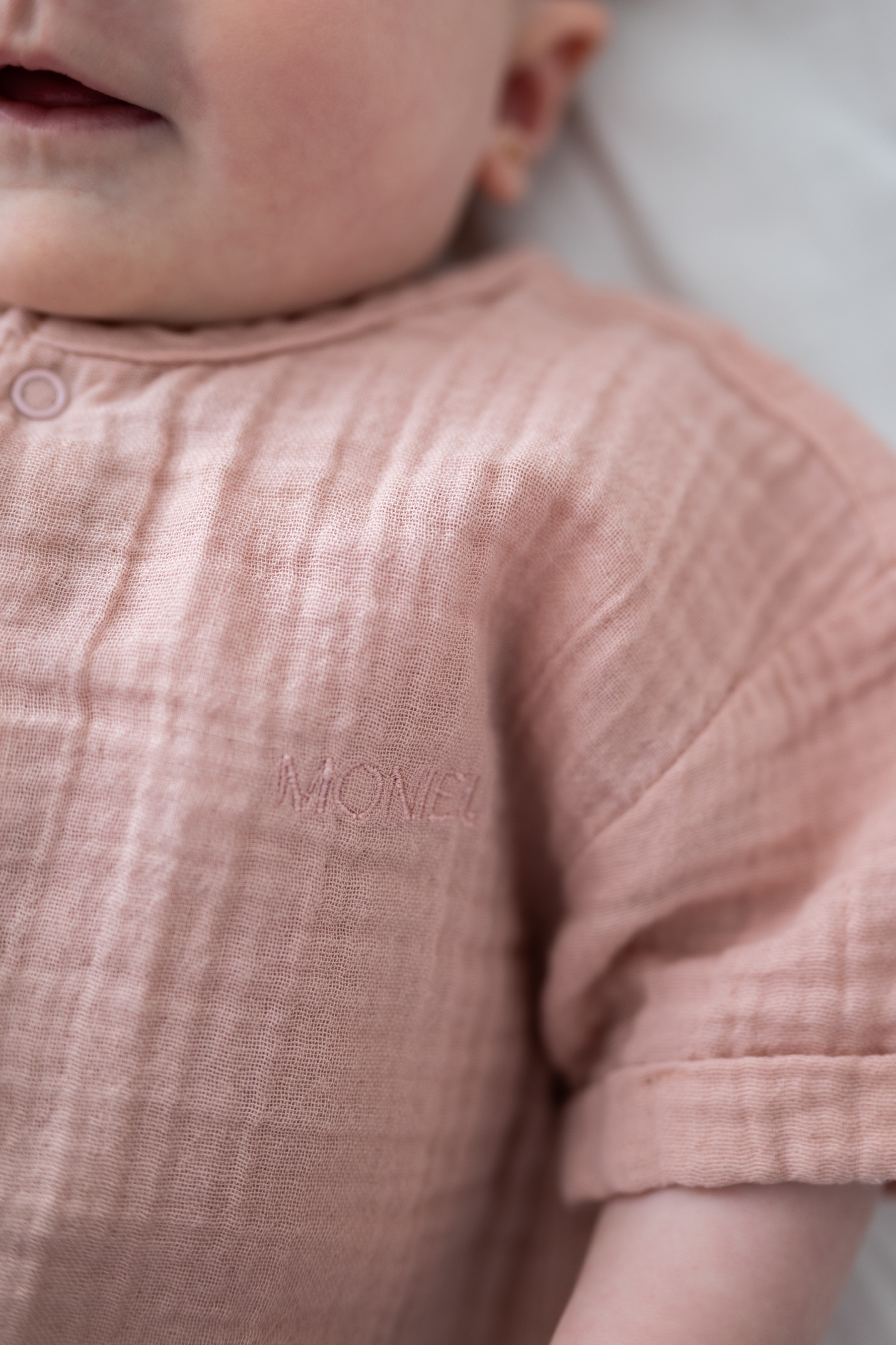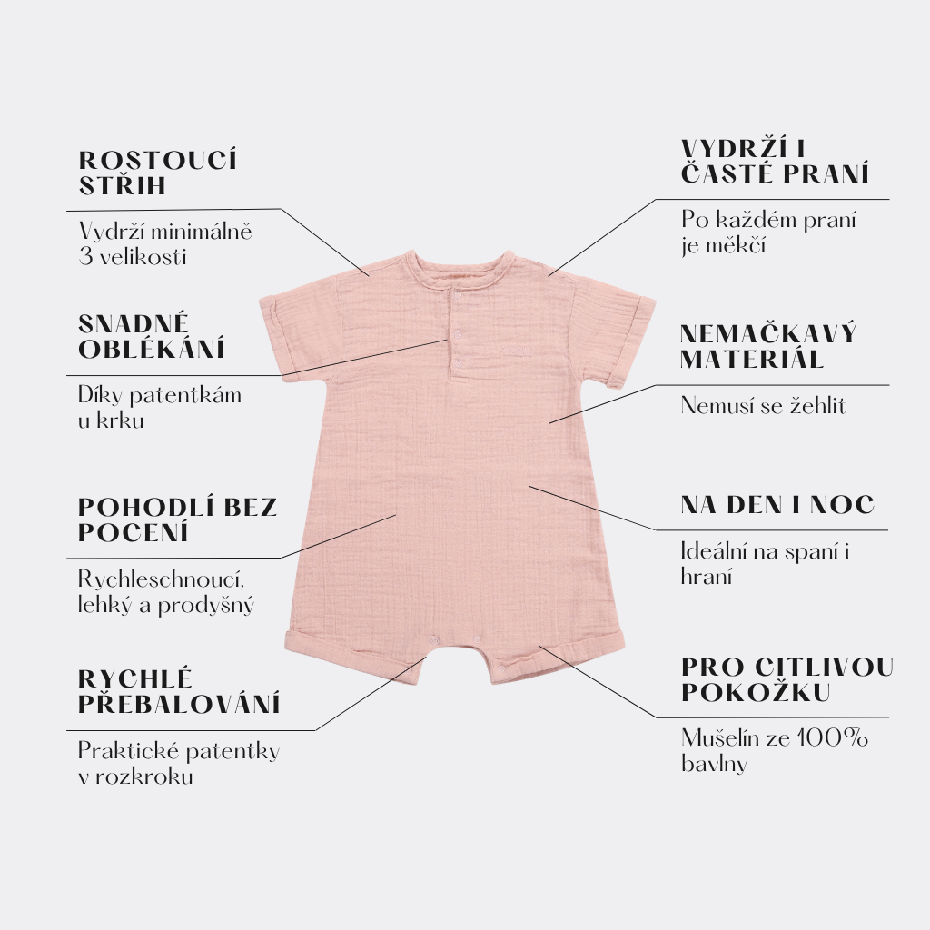 Dětský mušelínový overal s krátkým rukávem Moniel je ideální oblečení na jaro a léto. Má oversize střih a vydrží tři běžné dětské velikosti. Je prodyšný, hebký a skvělý do horkých dnů. Má patentky u krku a v rozkroku pro pohodlné oblékání i přebalování miminka. Velikosti od narození až do dvou let.