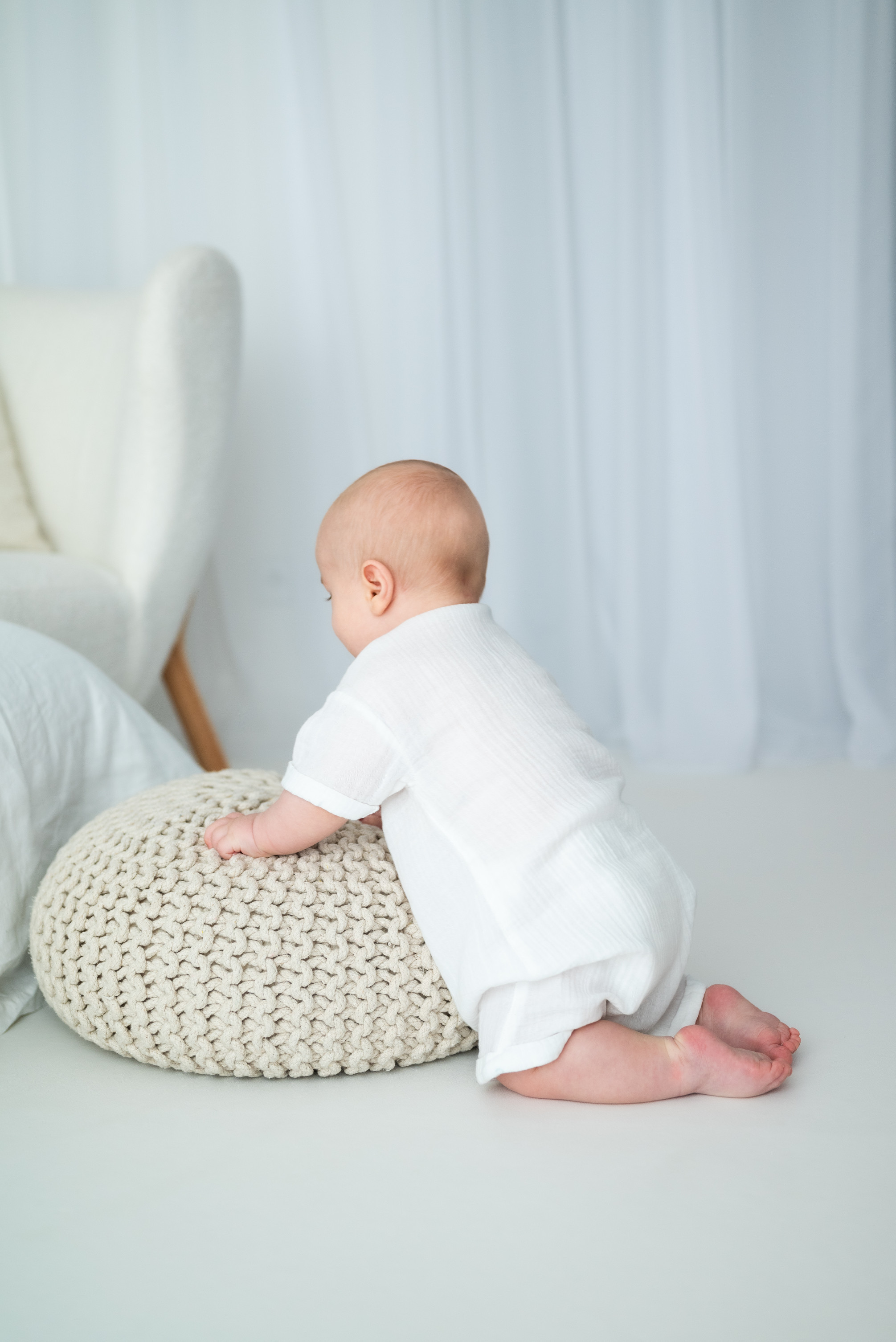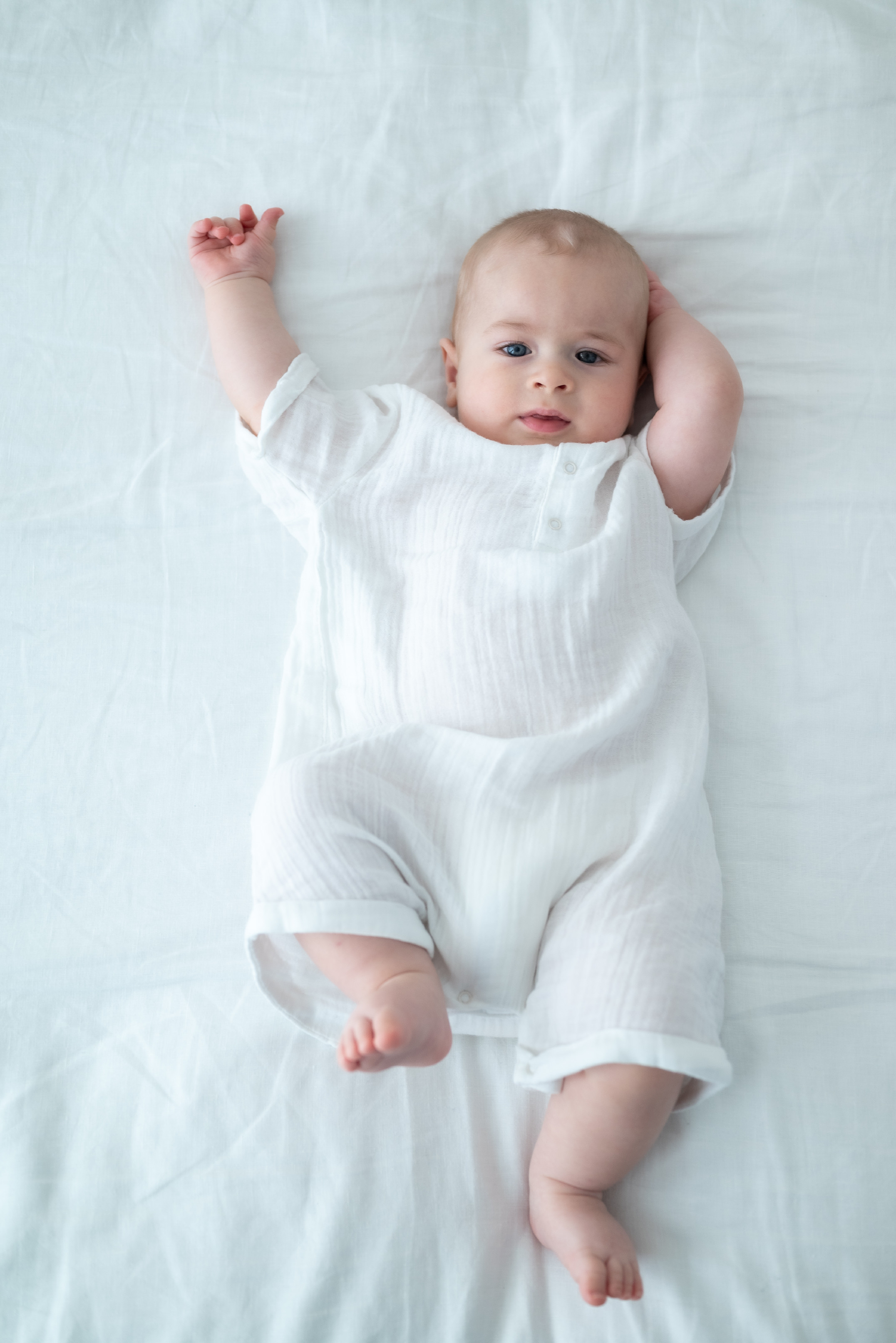 Dětský mušelínový overal s krátkým rukávem Moniel je ideální oblečení na jaro a léto. Má oversize střih a vydrží tři běžné dětské velikosti. Je prodyšný, hebký a skvělý do horkých dnů. Má patentky u krku a v rozkroku pro pohodlné oblékání i přebalování miminka. Velikosti od narození až do dvou let.