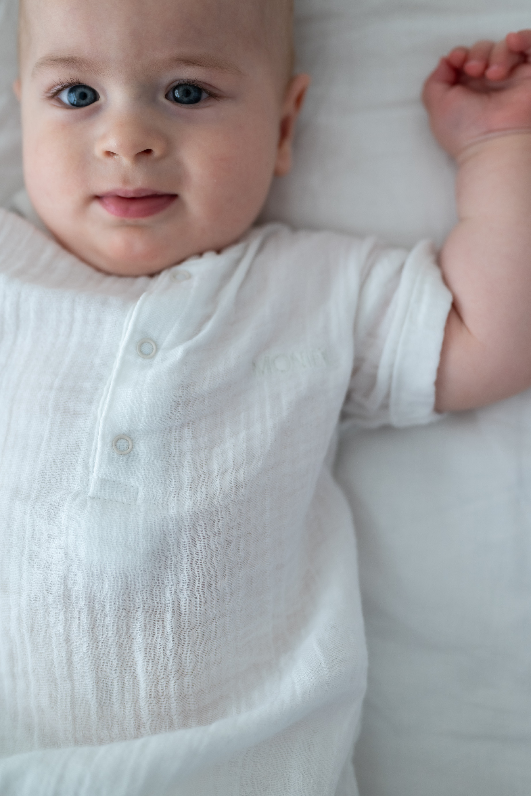 Dětský mušelínový overal s krátkým rukávem Moniel je ideální oblečení na jaro a léto. Má oversize střih a vydrží tři běžné dětské velikosti. Je prodyšný, hebký a skvělý do horkých dnů. Má patentky u krku a v rozkroku pro pohodlné oblékání i přebalování miminka. Velikosti od narození až do dvou let.