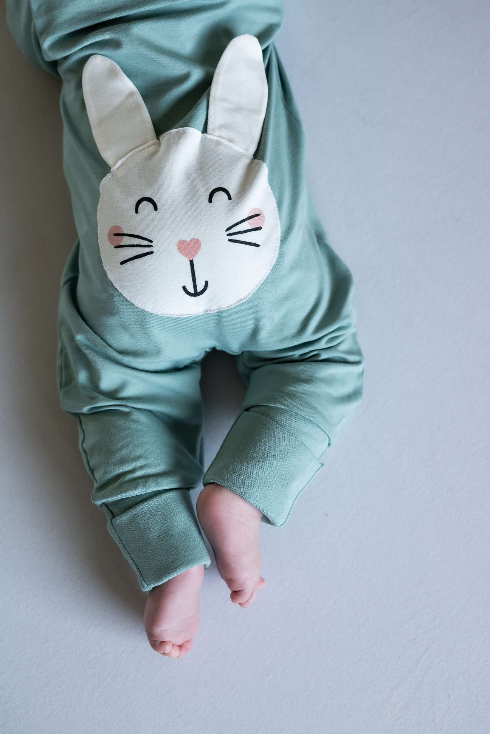 Je ručně ušitý v České republice z přírodního materiálu příjemného na dotek. Materiál se nemačká, takže pokud nechcete, nemusíte jej žehlit. Autorský design overálku s tečkami doplňuje roztomilý obličej zvířátka na zadní straně overálku.