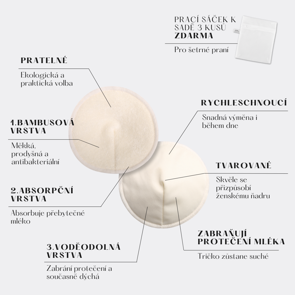 Bambusová kojicí podprsenka se speciální kapsou na vyjímatelné prsní vložky je vhodná pro denní i noční kojení. Má promyšlený střih a zavinovací výstřih, který umožňuje snadné a pohodlné kojení bez rozepínání. Součástí sady jsou 2 ks pratelných bambusových prsních vložek a prací sáček jako dárek. Vhodná pro malá i velká prsa.
