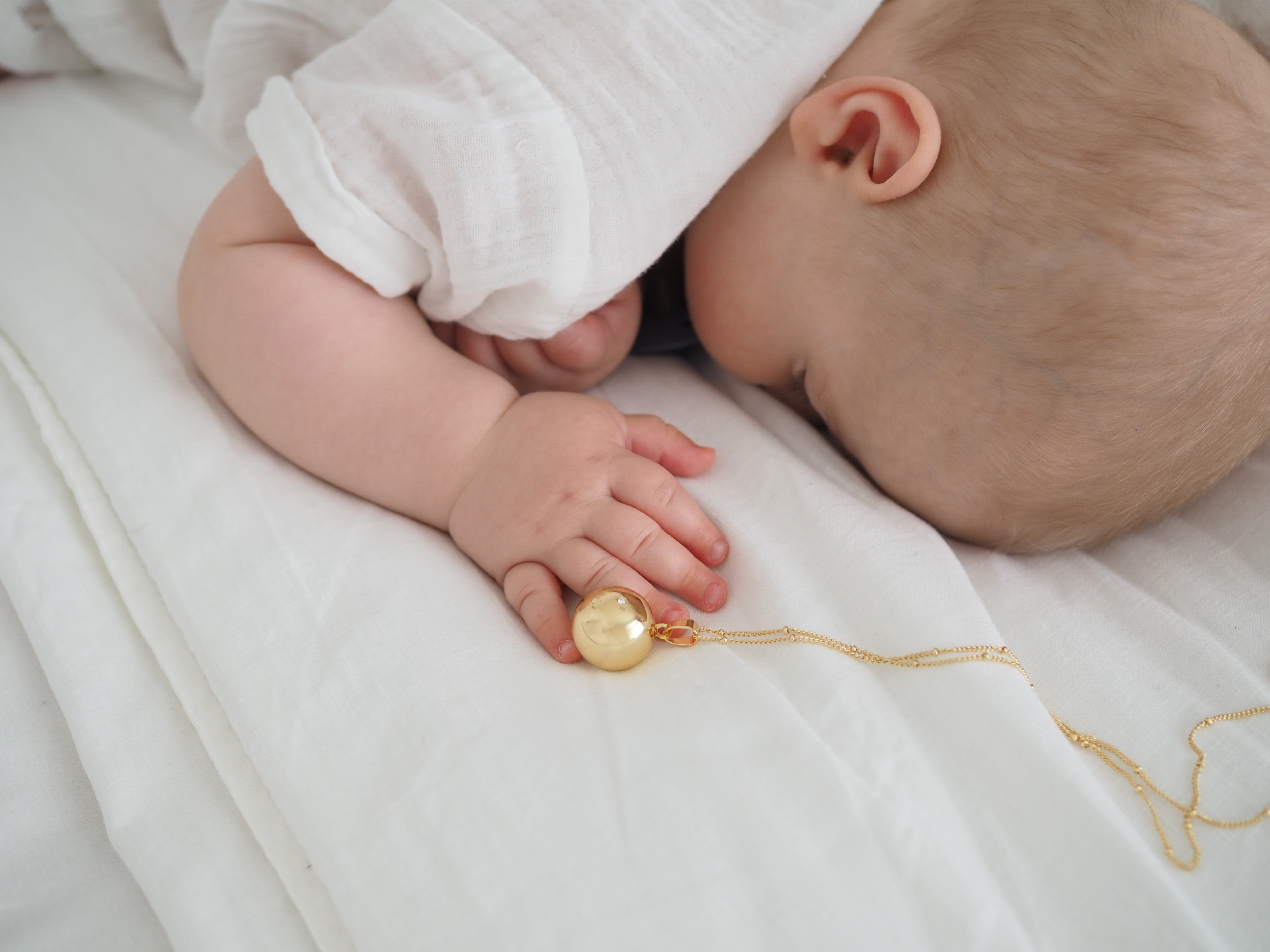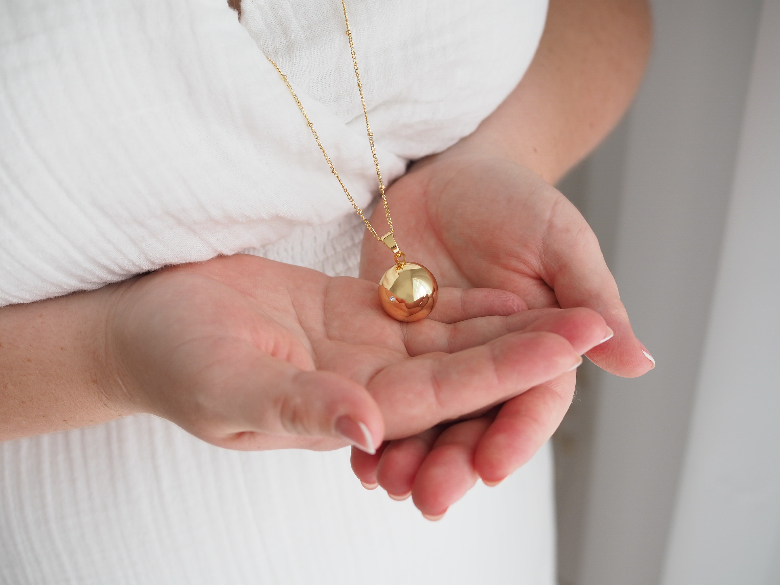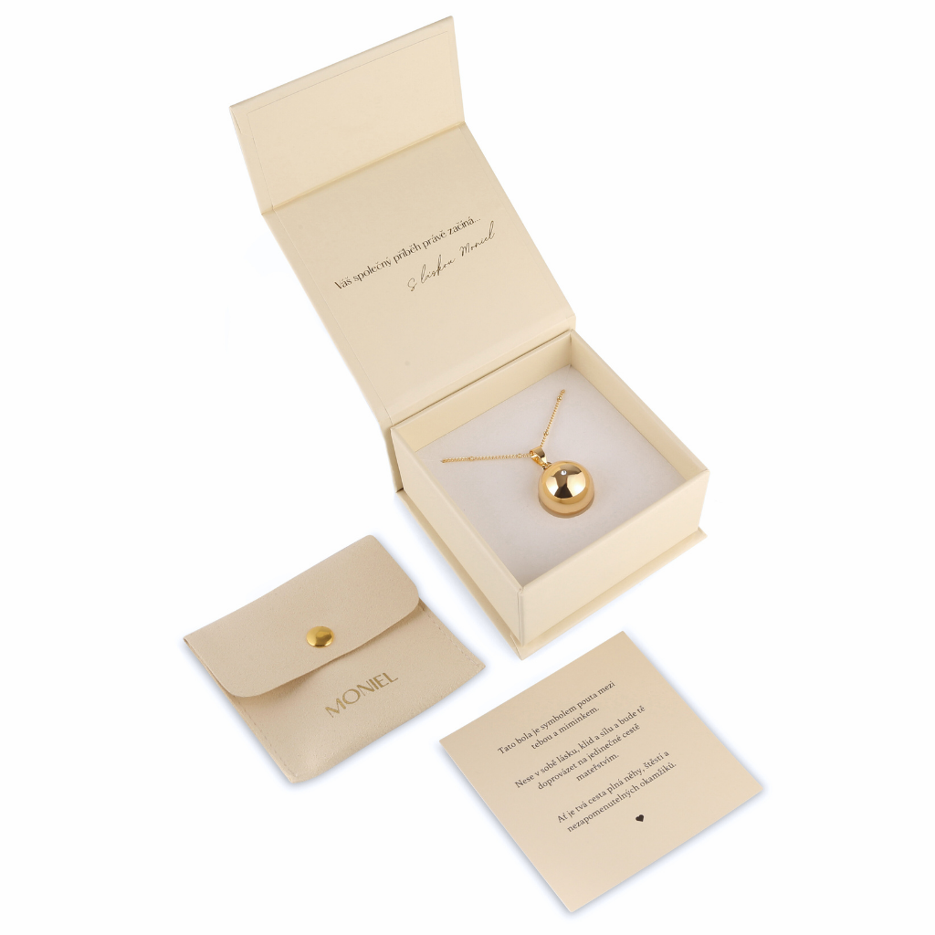 Těhotenská pozlacená bola Moniel Glow s řetízkem je nádherný šperk a symbol pouta mezi maminkou a miminkem. Nese v sobě lásku, klid a sílu a bude vás doprovázet na jedinečné cestě mateřstvím. Bolu unosíte nejen po celé období těhotenství, ale využijete ji i po porodu pro uklidnění miminka.