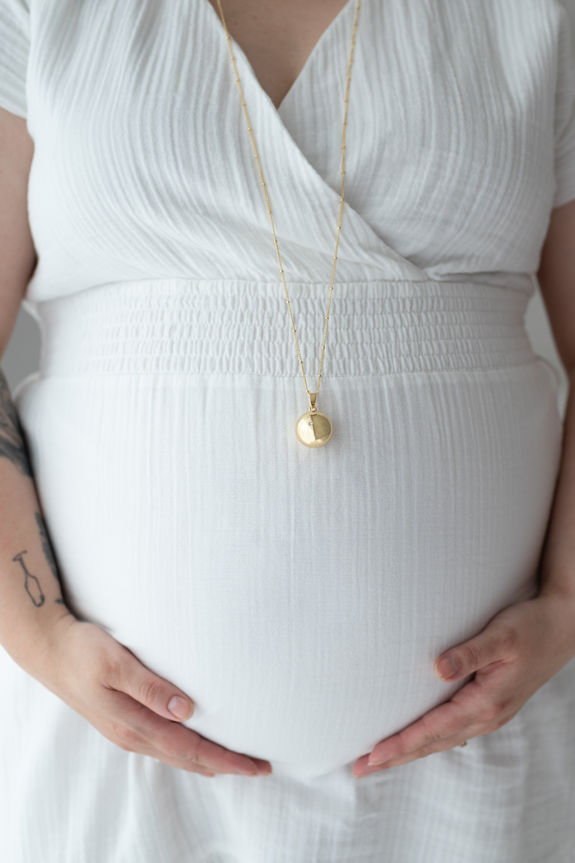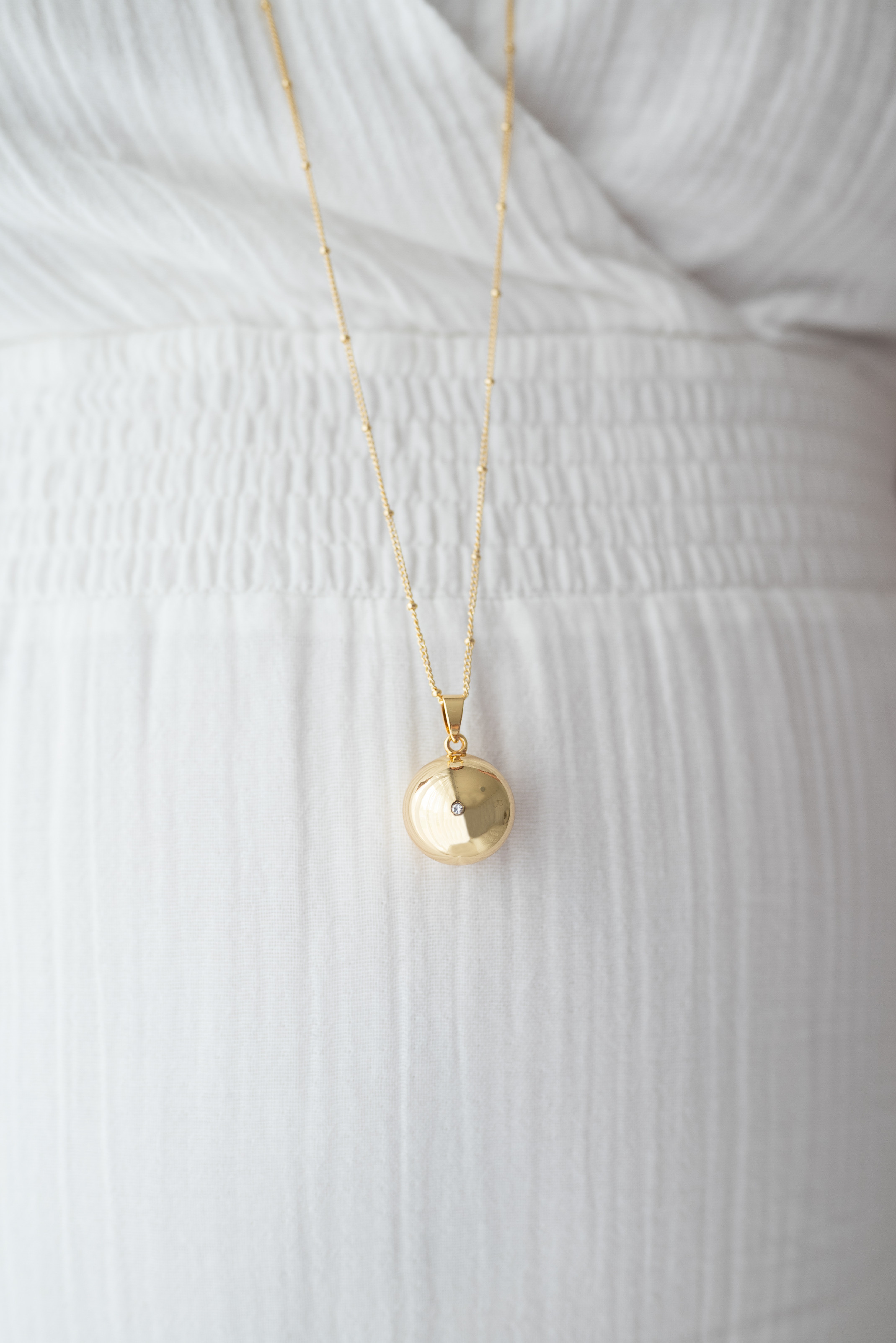 Rolnička je vyrobena z odolné a pevné mosazi a následně pozlacena 18 karátovým zlatem. Řetízek je vyrobený z chirurgické oceli a pozlacen 18 karátovým zlatem. Tyto materiály zaručují, že bola bude držet svůj tvar, bude nádherně hladká a elegantní. Bola neobsahuje nikl ani olovo a je tak šetrná k pokožce.