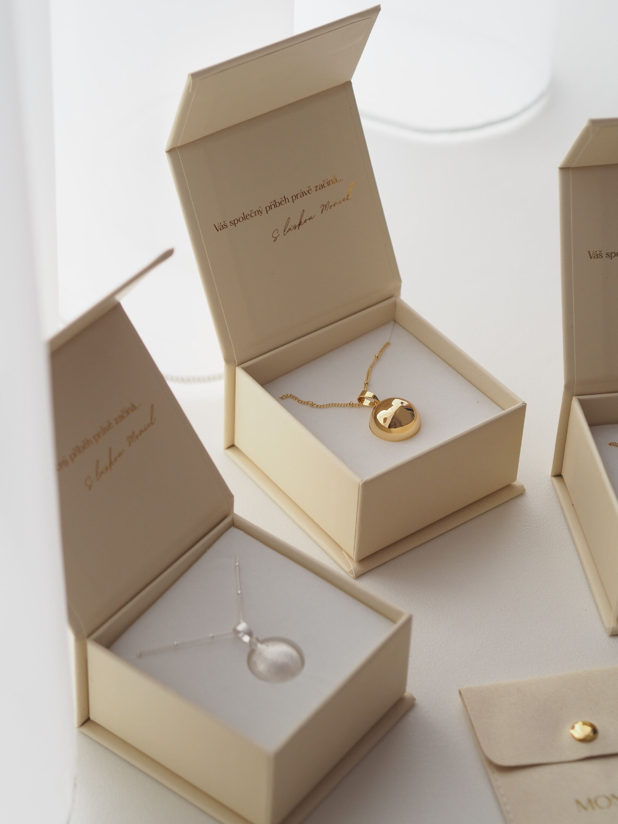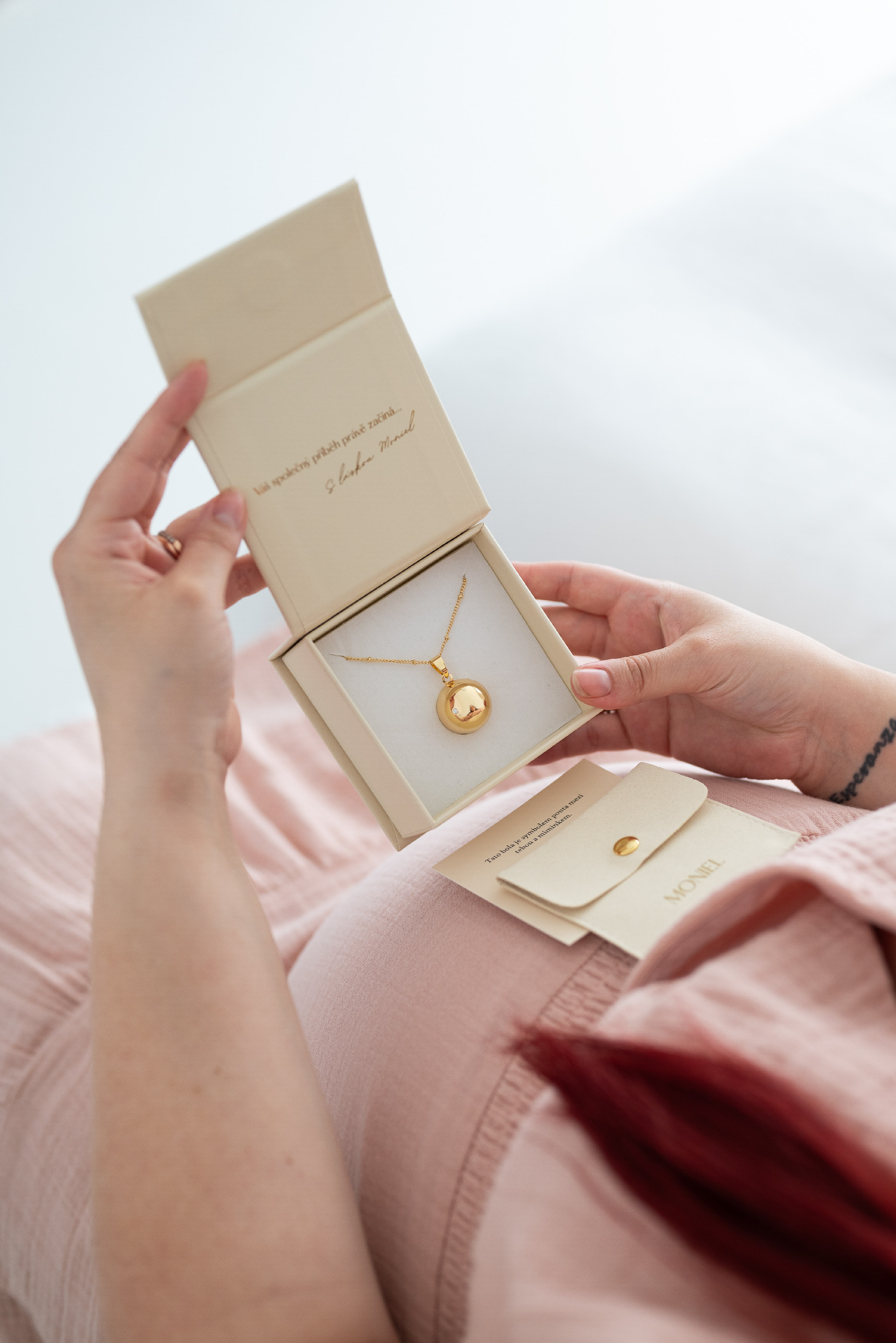 Těhotenskou bolu Moniel obdržíte společně s řetízkem v nádherném dárkovém balení s magnetickým zapínáním. Součástí balení je luxusní koženkové sametové pouzdro, do kterého si bolu můžete uschovat ve chvíli, kdy ji nebudete chtít nosit nebo ji budete potřebovat uložit do kabelky například během kontroly u lékaře.