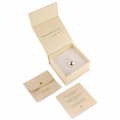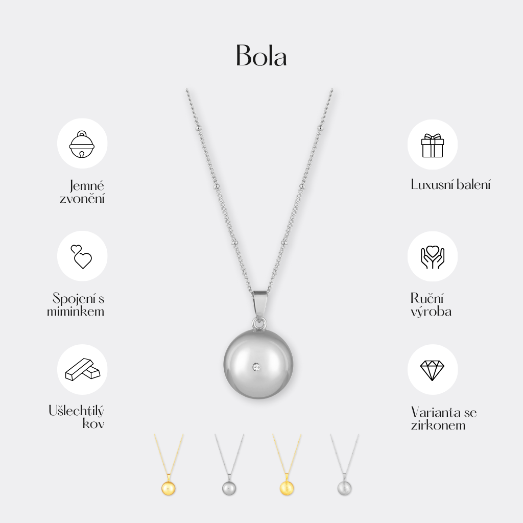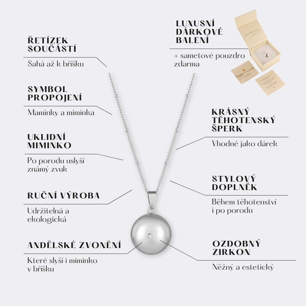 Těhotenská bola Moniel Grace s bílým kamínkem a řetízkem bude je dokonalým šperkem a vzpomínkou na období těhotenství. Rolnička má uklidňující zvuk, který si miminko zapamatuje a poskytne mu uklidňující pocit bezpečí i po narození. Bola je postříbřena stříbrem nejvyšší kvality a ozdobena zirkonem. Součástí sady je bola, řetízek, dárková krabička, luxusní koženkové pouzdro na bolu a kartička s osobním vzkazem.