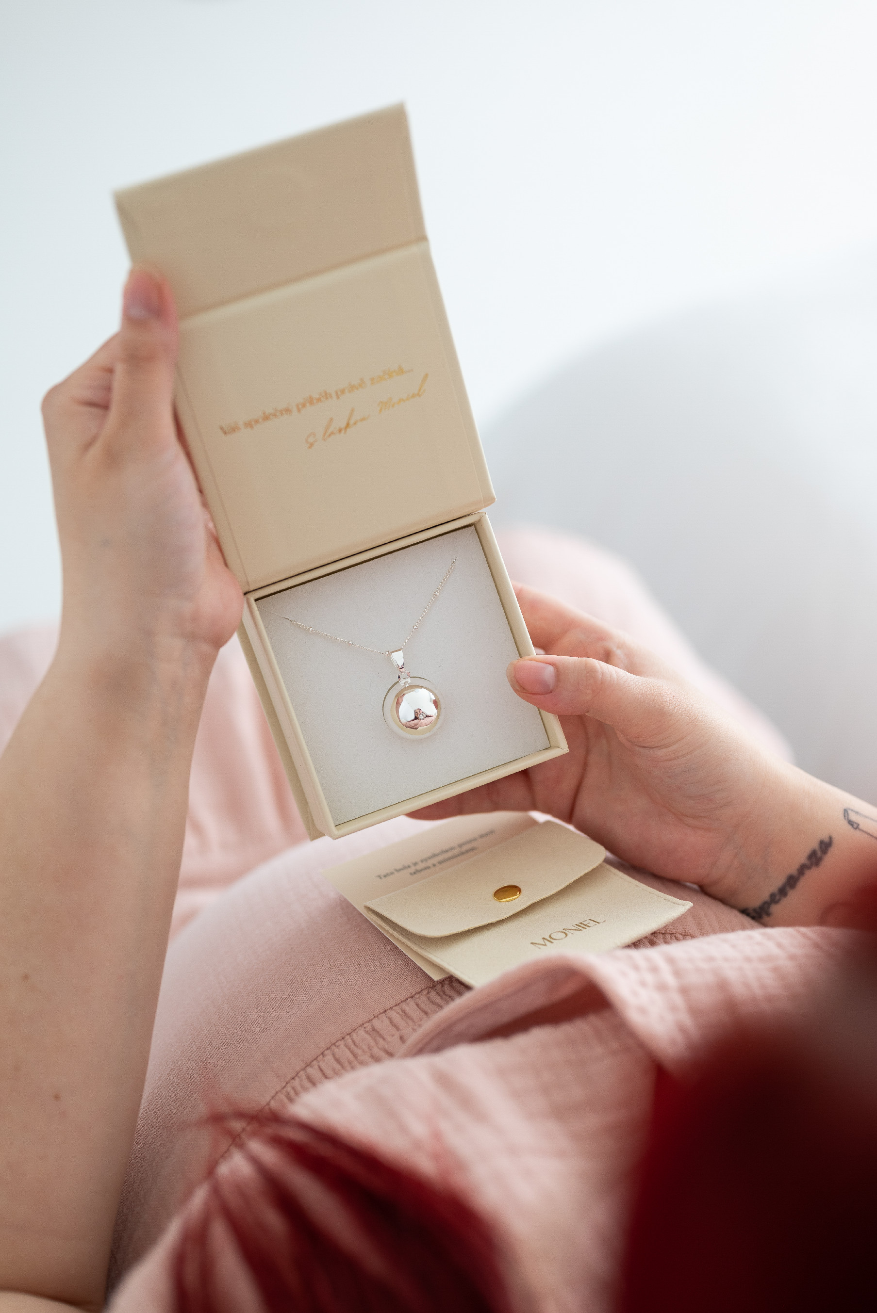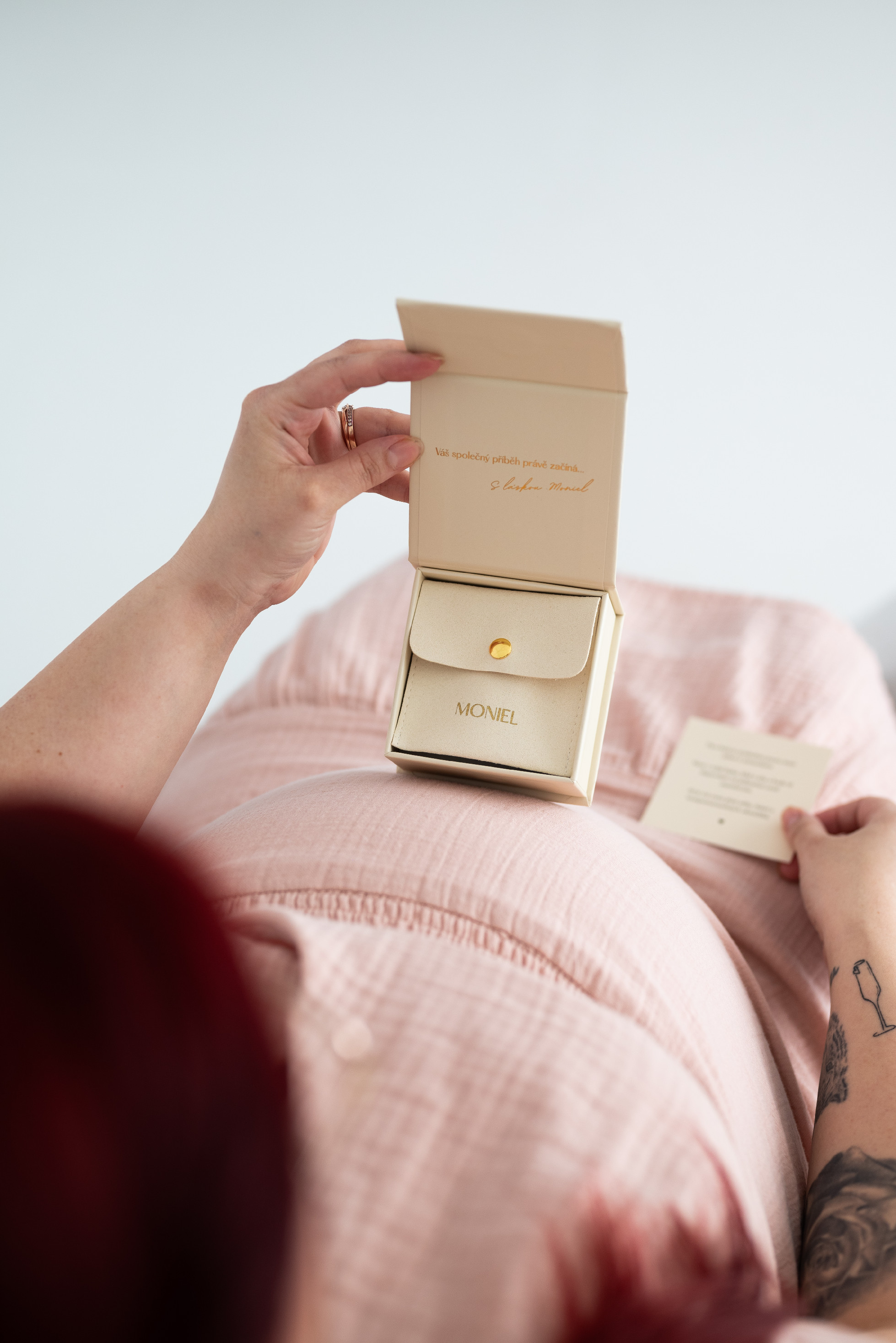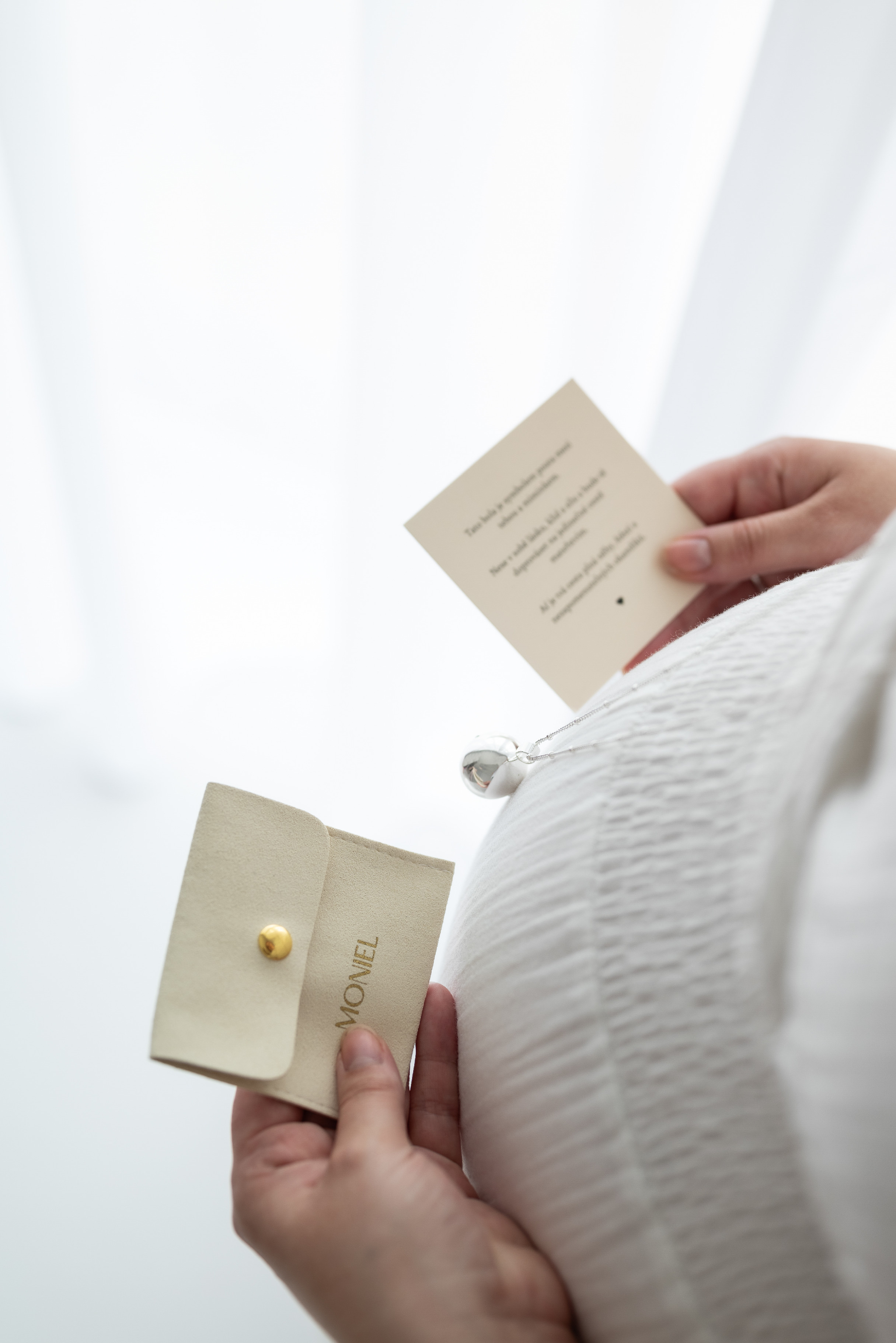 Těhotenskou bolu Moniel obdržíte společně s řetízkem v nádherném dárkovém balení s magnetickým zapínáním. Součástí balení je luxusní koženkové sametové pouzdro, do kterého si bolu můžete uschovat ve chvíli, kdy ji nebudete chtít nosit nebo ji budete potřebovat uložit do kabelky například během kontroly u lékaře.