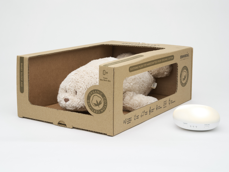 Moonie usínáček v podobě roztomilého tuleně s nočním světlem a relaxačními zvuky pomáhá miminku uklidnit se a snáze usnout. Uklidňující zvuky připomínají dítěti prostředí v děloze maminky před jeho narozením. Usínáček nabízí pět přírodních relaxačních zvuků (tlukot srdce, vítr, lesní potok, mořské vlny, déšť), kalimba ukolébavku, dvě klasické ukolébavky a umožňuje nahrání vlastního hlasu.