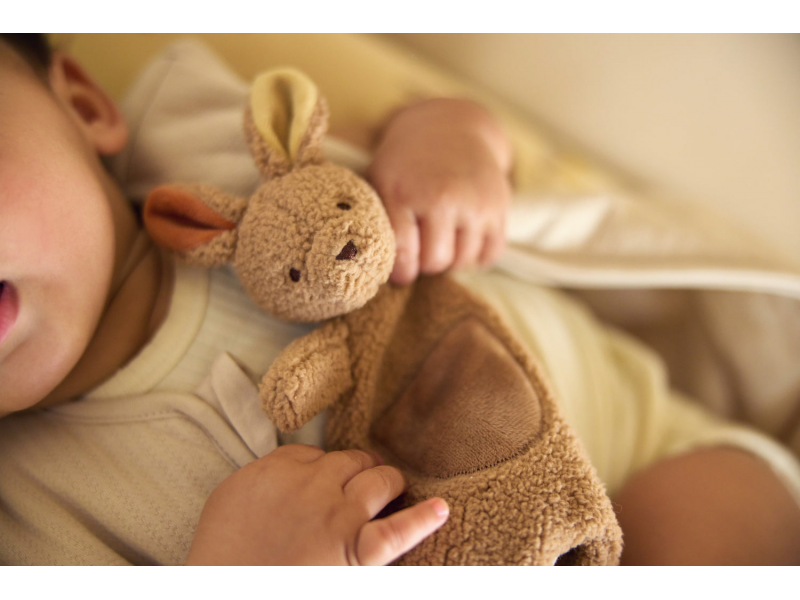Roztomilý muchláček v podobě klokana z jemného fleece materiálu láká ke hraní i mazlení před spaním v postýlce či v kočárku. Poutko umožňuje připevnit k muchláčkovi šidítko, které tak v postýlce vždy snadno najdete.