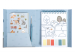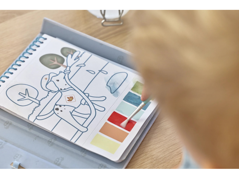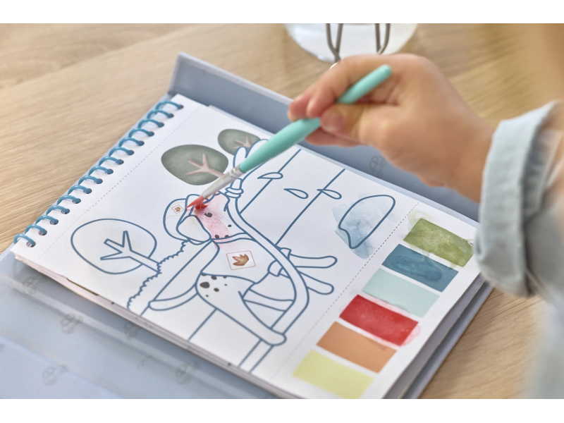 Díky pevnému obalu s magnetickým zapínáním a poutkem na štětec je vše úhledně pohromadě. Spirála ve hřbetu umožňuje snadné otáčení stránek omalovánek.