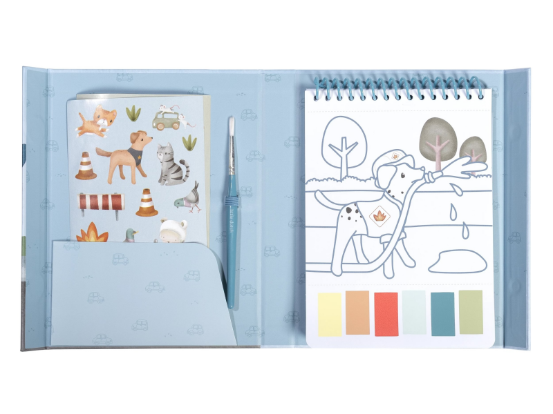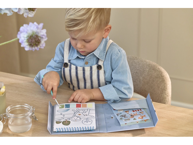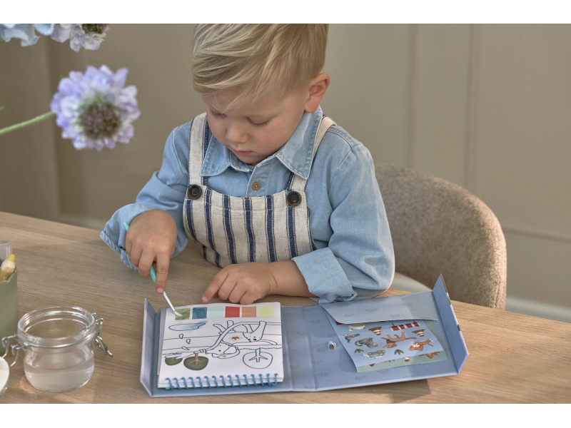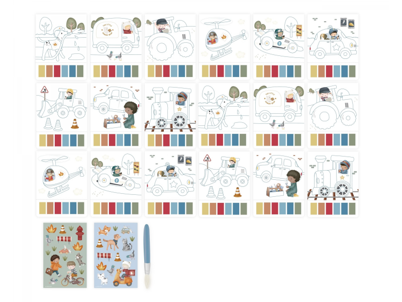 Krásné omalovánky na silném papíru obsahují 18 stránek s jednoduchými obrázky dopravních prostředků k vybarvování. Každá stránka nabízí vlastní paletu akvarelových barev pro vybarvování štětcem, takže použití je velmi jednoduché. Pro větší zábavu jsou součástí i dva archy krásných barevných samolepek pro dotvoření obrázků.