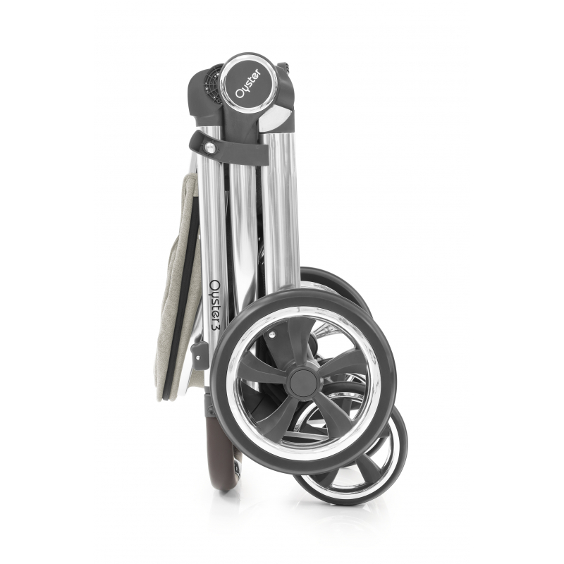 Skládání u Oyster3 je přesně takové jaké si rodiče přejí a hlavně potřebují – jednoduché! Celý kočárek lze složit i se sedací částí na rámu a to v jakémkoliv směru. Stačí sklopit sedací část a použít pojistky na vnitřních stranách rukojeti. Kočárek sklopíte, a když se podíváte dolů, uvidíte plastovou ručku, tu chytnete a kočárek se složí. Automaticky se zacvakne pojistka skládání, která rám uzamkne. Perfektní vlastností je, že kočárek po složení samostatně stojí. Pro rozložení kočárku uvolníte pojistku skládání a jedním tahem rám otevřete. Kompaktní velikost vám umožní kočárek pohodlně uložit do kufru auta a ještě máte spoustu místa na nákup a ostatní věci.