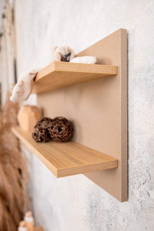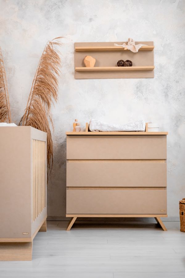 Nástěnná police v barvě nejoblíbenější italské kávy má dvě prostorné police, aby jste měli všechny potřeby pro přebalování a každodenní péči o dítě po ruce. Navíc šetří místo a je praktickým doplňkem, který dotváří celkový design dětského pokoje.