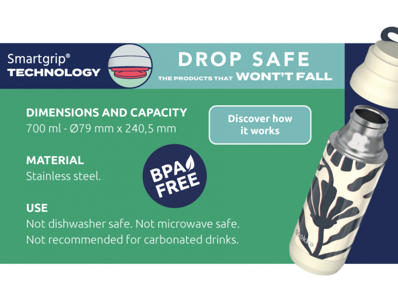 Quokka Pulse je součástí kolekce lahví a hrnků Drop Safe se speciálním dnem Smartgrip®, které při postavení na hladký povrch brání převržení a nechtěnému vylití obsahu láhve.