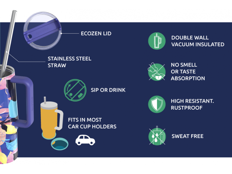 Termohrnek Quokka Vibe z vysoce kvalitní dvoustěnné oceli udrží teplotu nápoje studeného s ledem až 48 hodin, studeného až 14 hodin a teplého až 8 hodin. Termohrnek s vyjímatelným nerezovým brčkem umožňuje snadné pití bez nutnosti naklánění. Spolehlivý uzávěr z kvalitního Ecozen plastu chrání obsah před vylitím a umožňuje z termohrnku pít i bez brčka. Široké hrdlo umožňuje vložení kostek ledu a zároveň se díky němu hrnek snadno čistí.