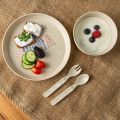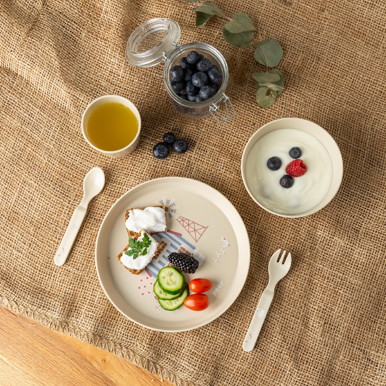 Lehký talíř s vyvýšeným okrajem, mělká lžička a vidlička se širokou rukojetí jsou ideální pro malé dětské ruce.